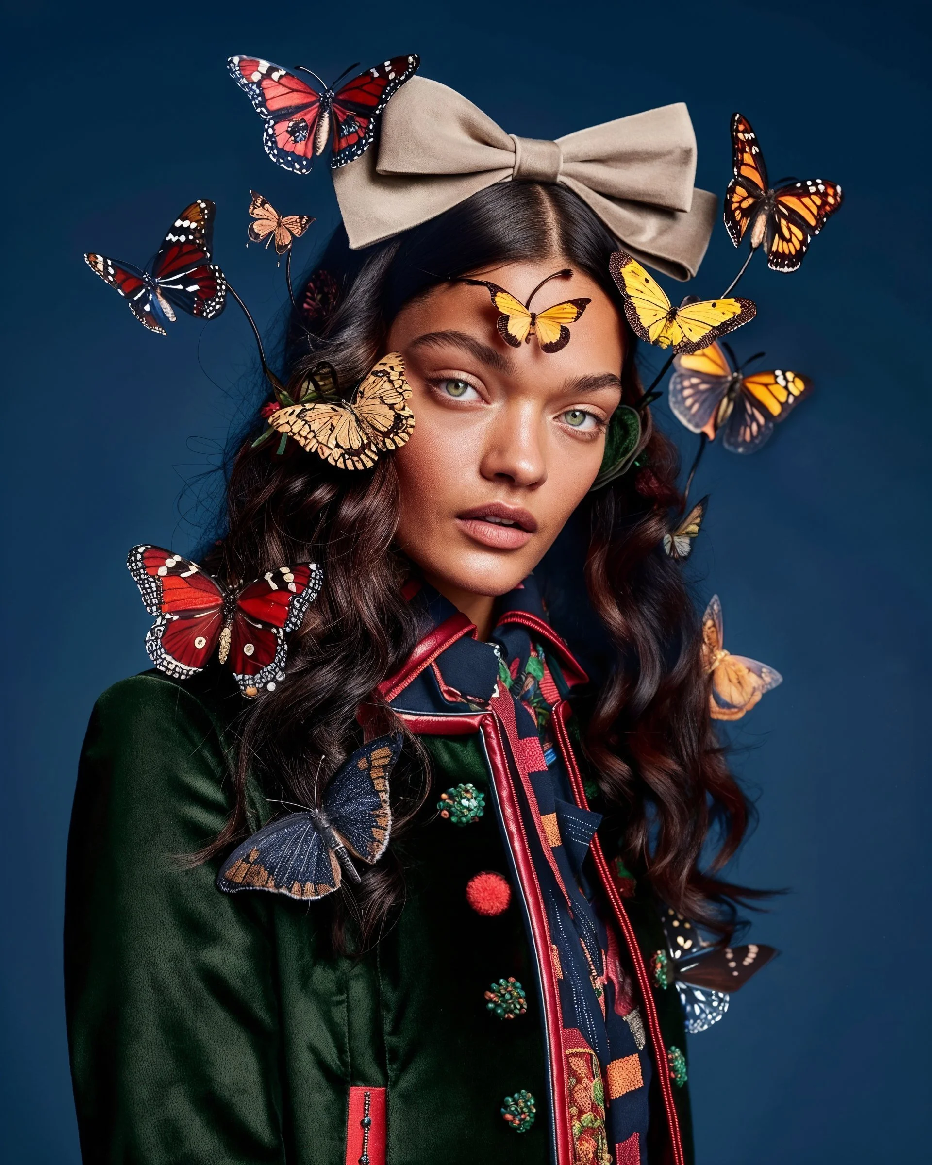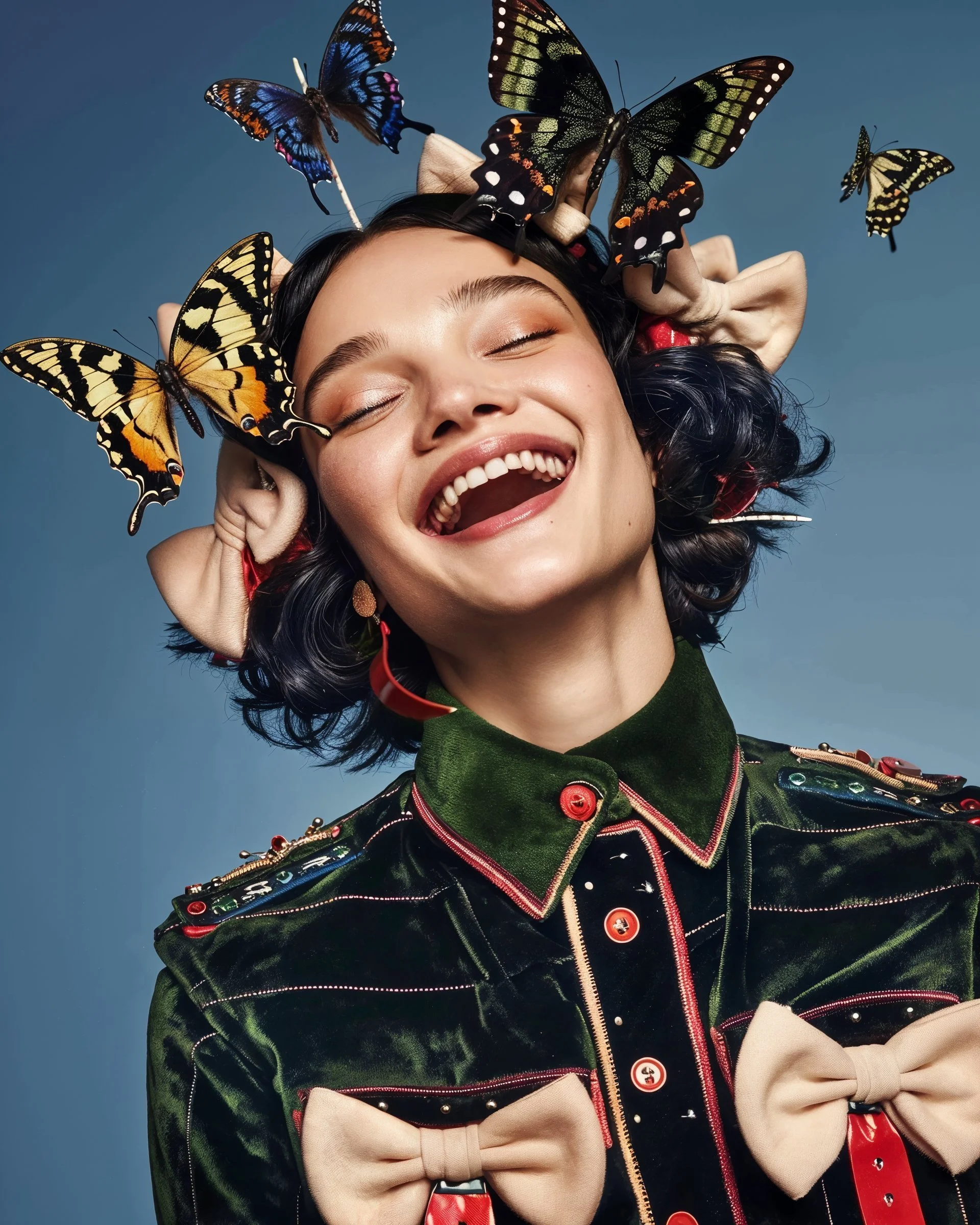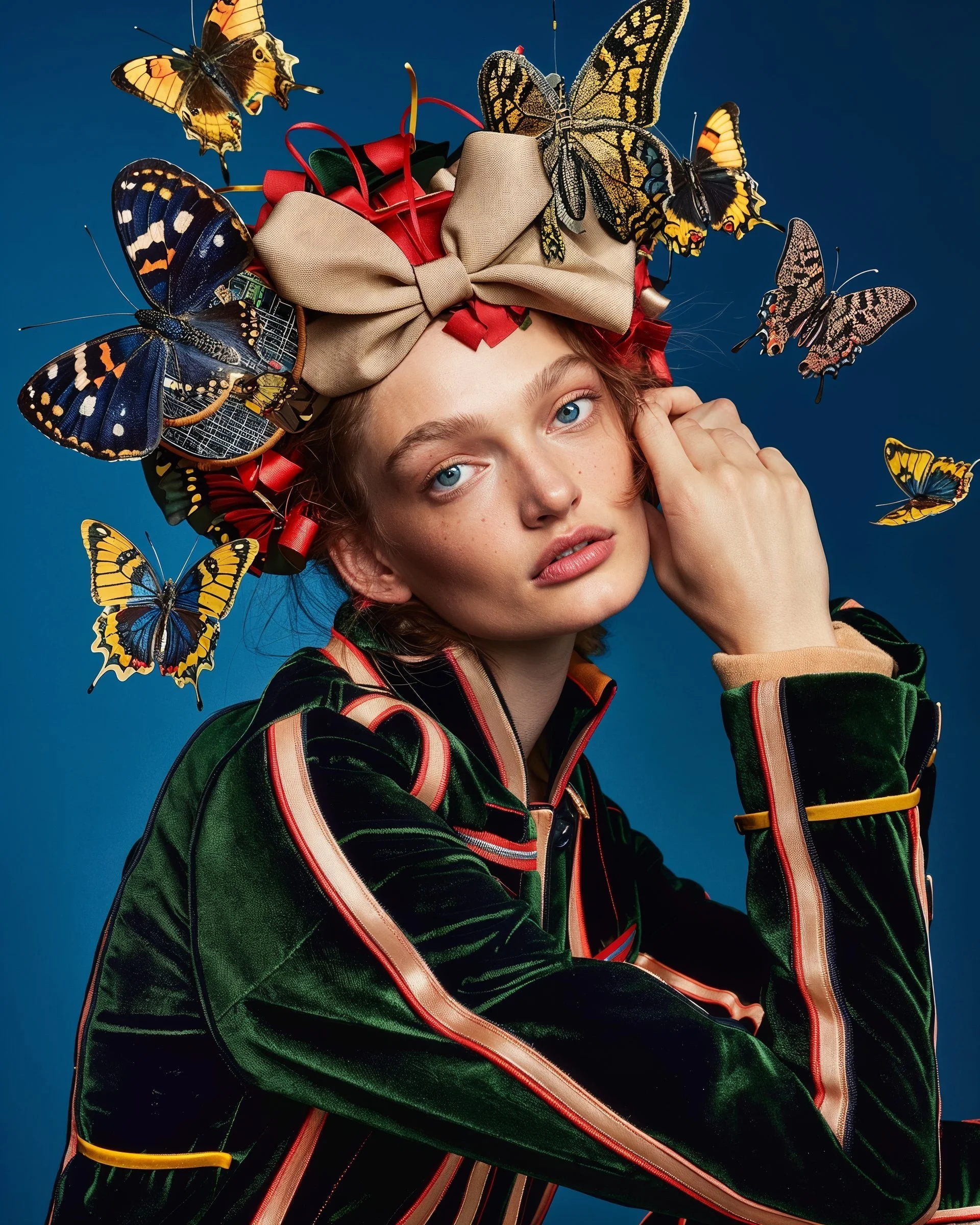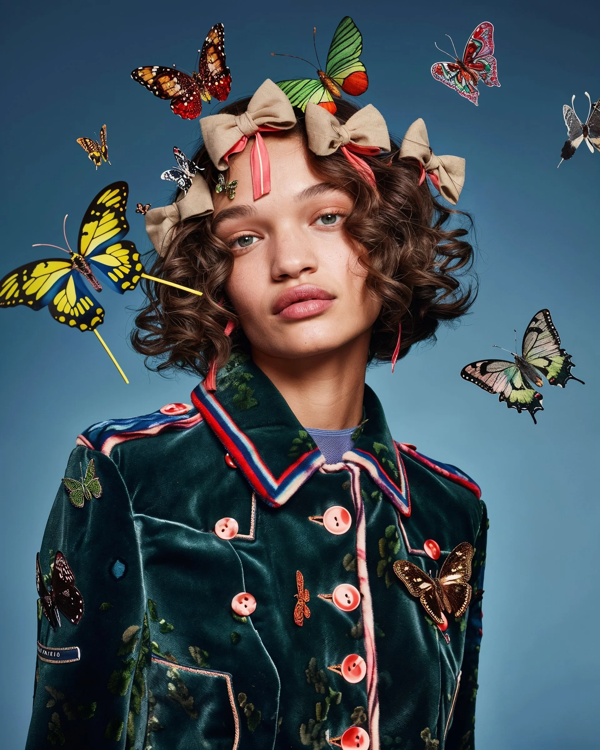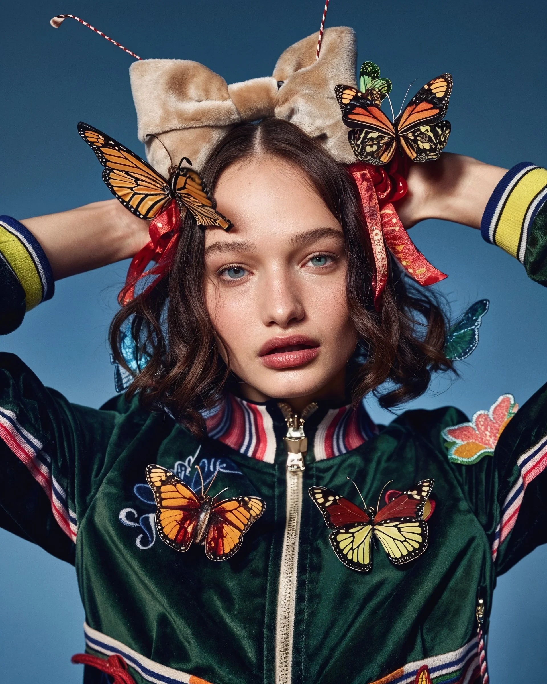 Taking cues from the luxury of velvet and the sporty edge of athletic wear, blending elements like bows, butterflies, and a hint of pizzazz. Each piece is crafted to evoke a sense of joy, with an eclectic blend of patterns and intricate details.