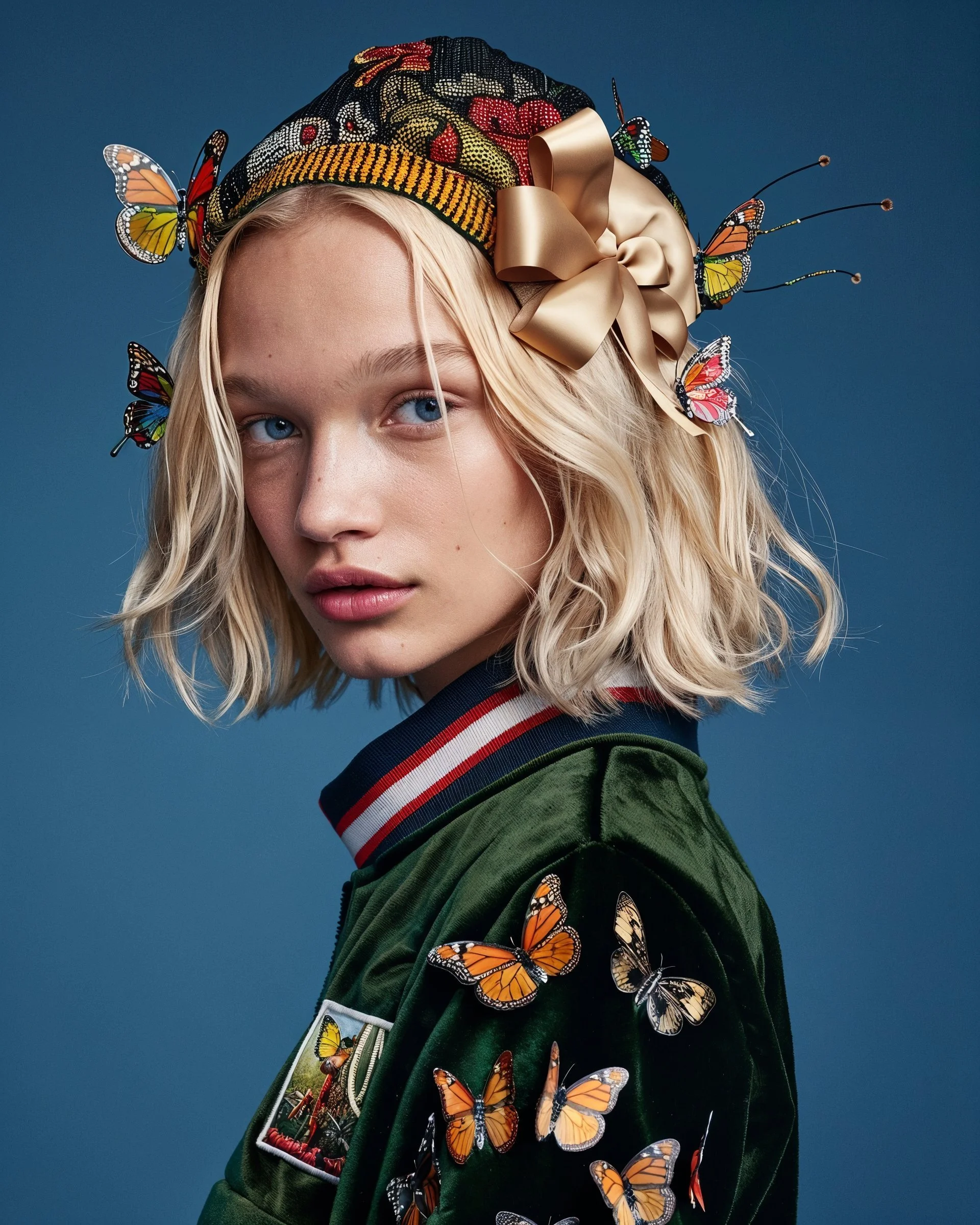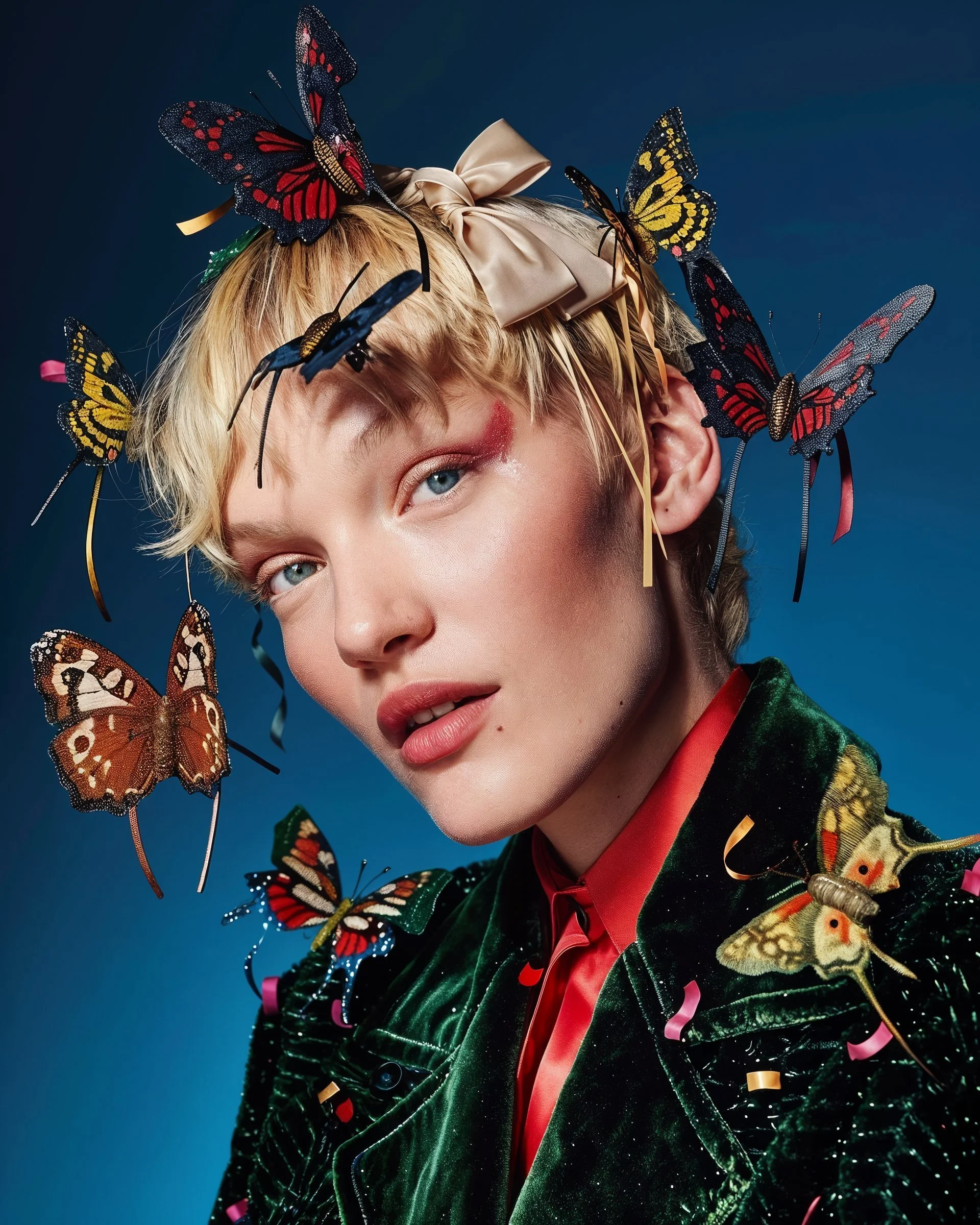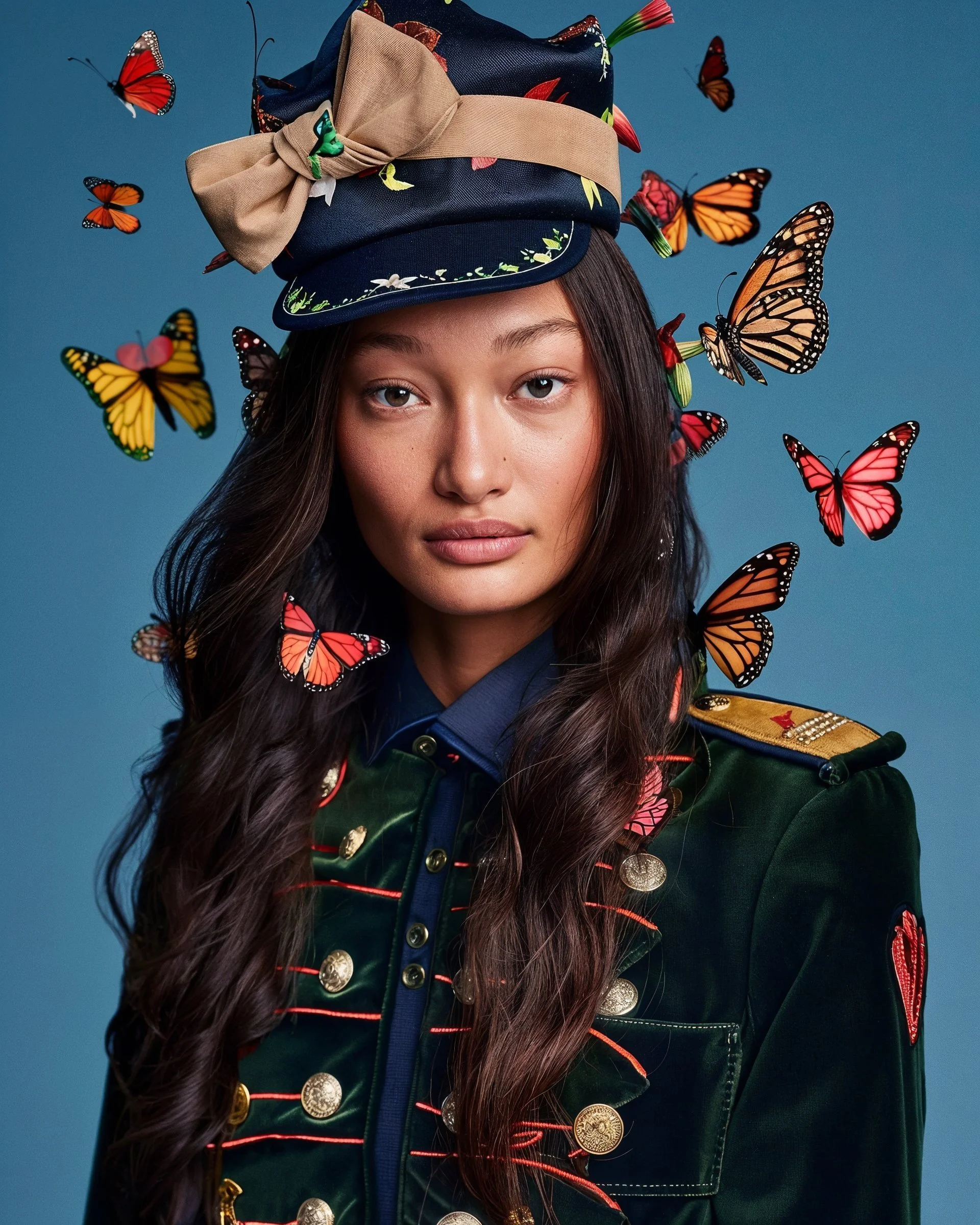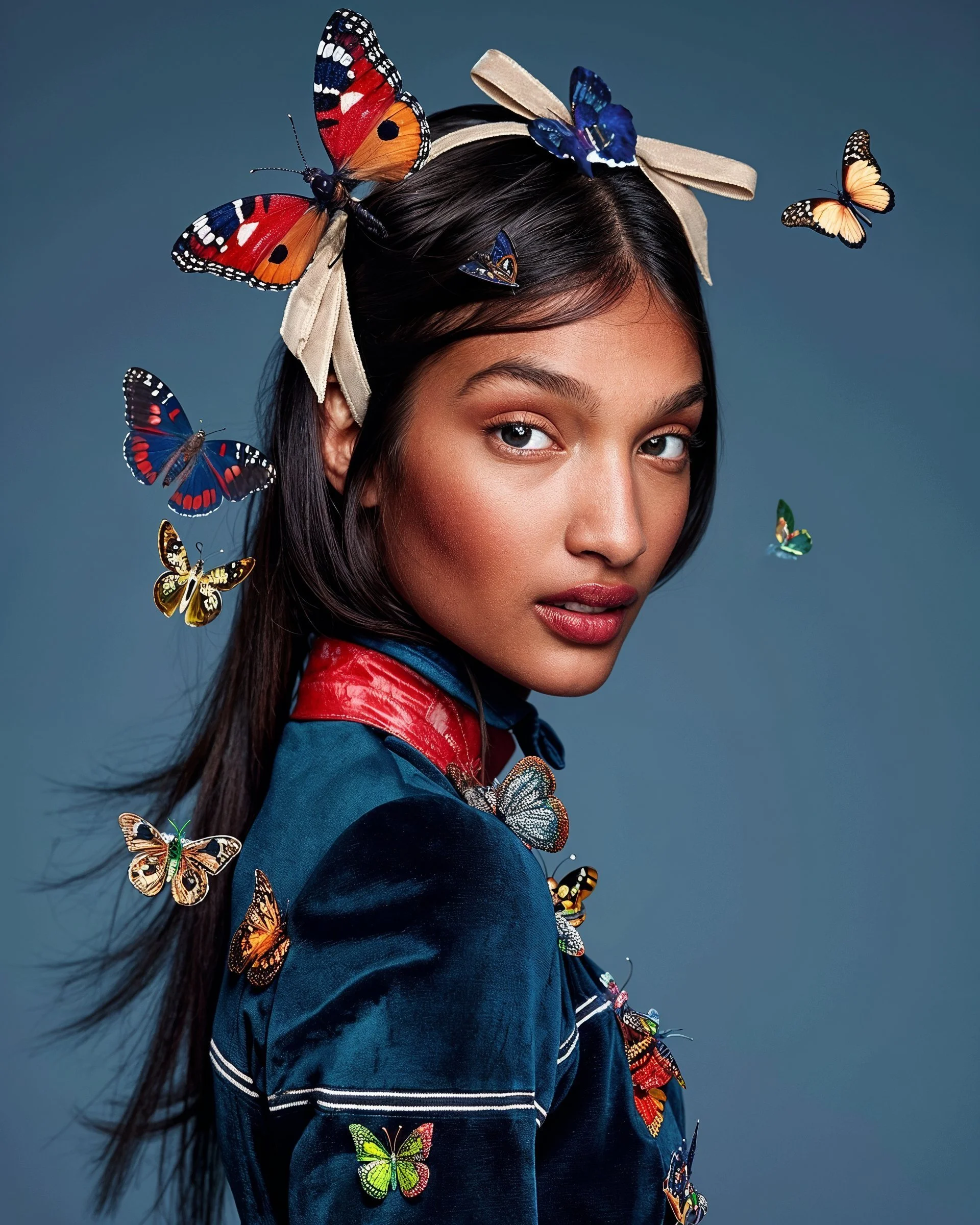 Taking cues from the luxury of velvet and the sporty edge of athletic wear, blending elements like bows, butterflies, and a hint of pizzazz. Each piece is crafted to evoke a sense of joy, with an eclectic blend of patterns and intricate details.