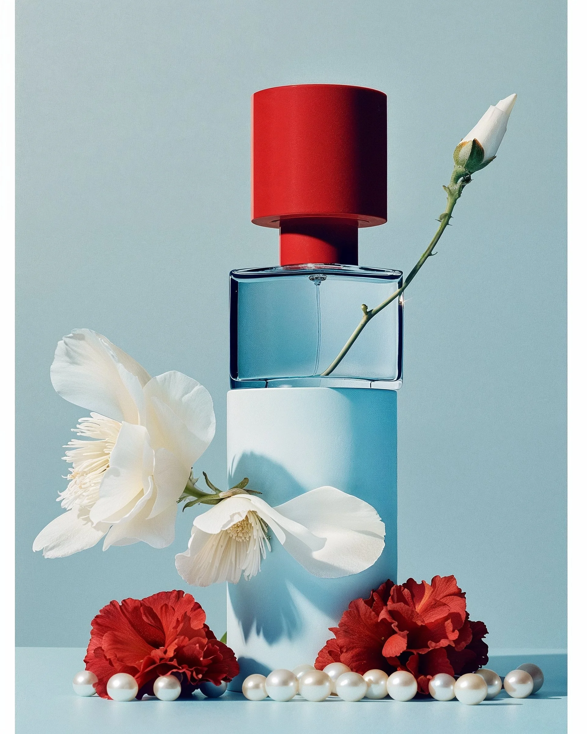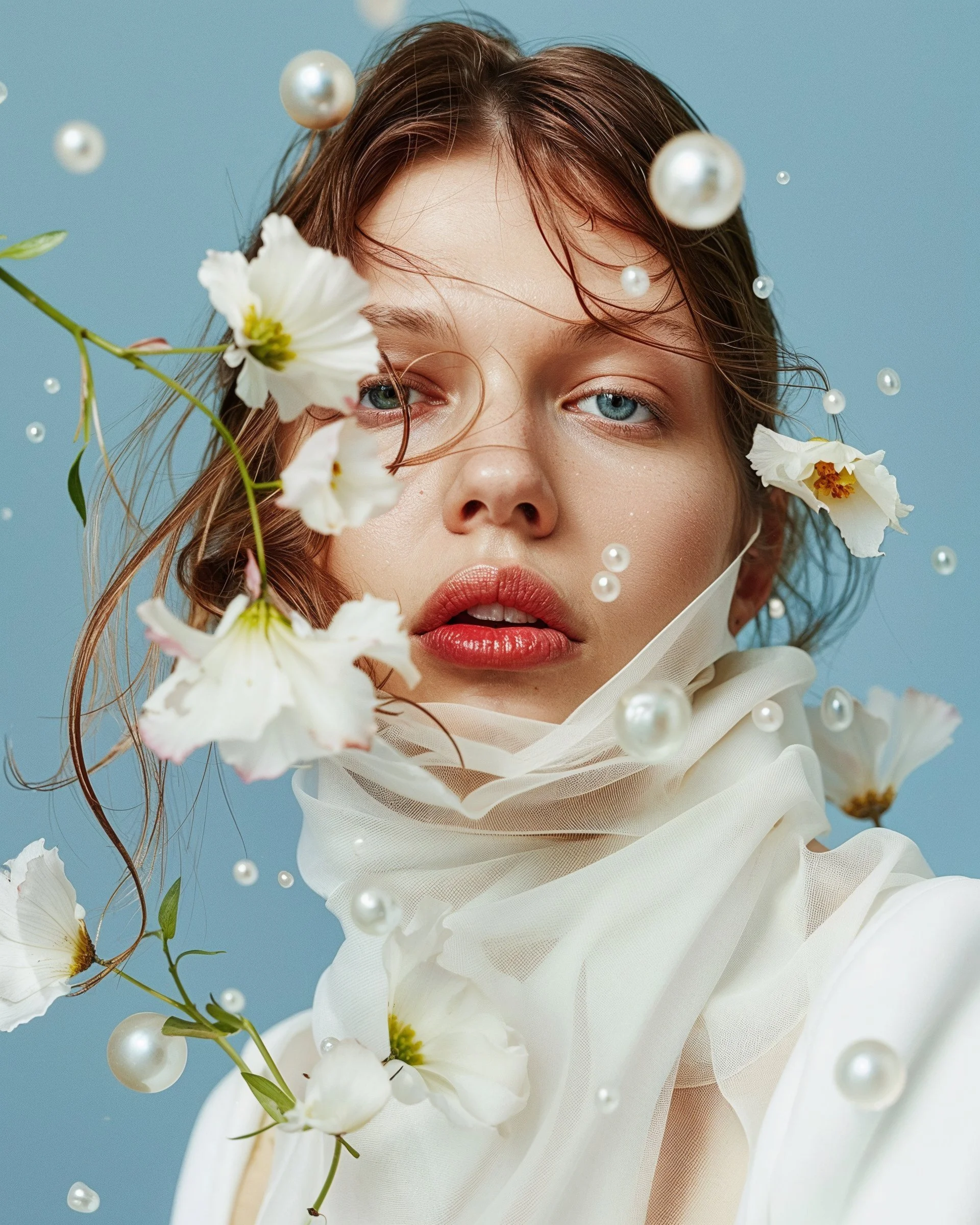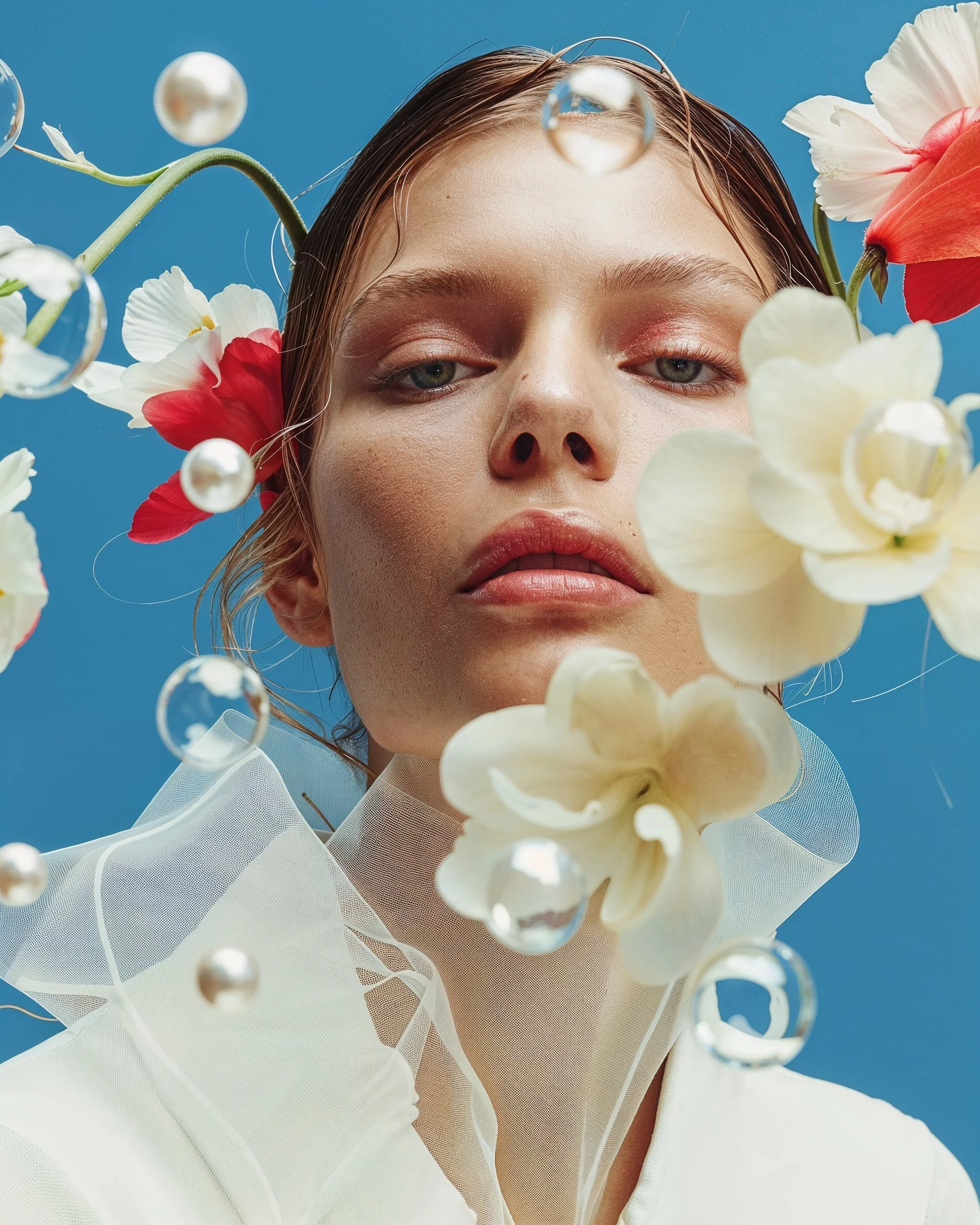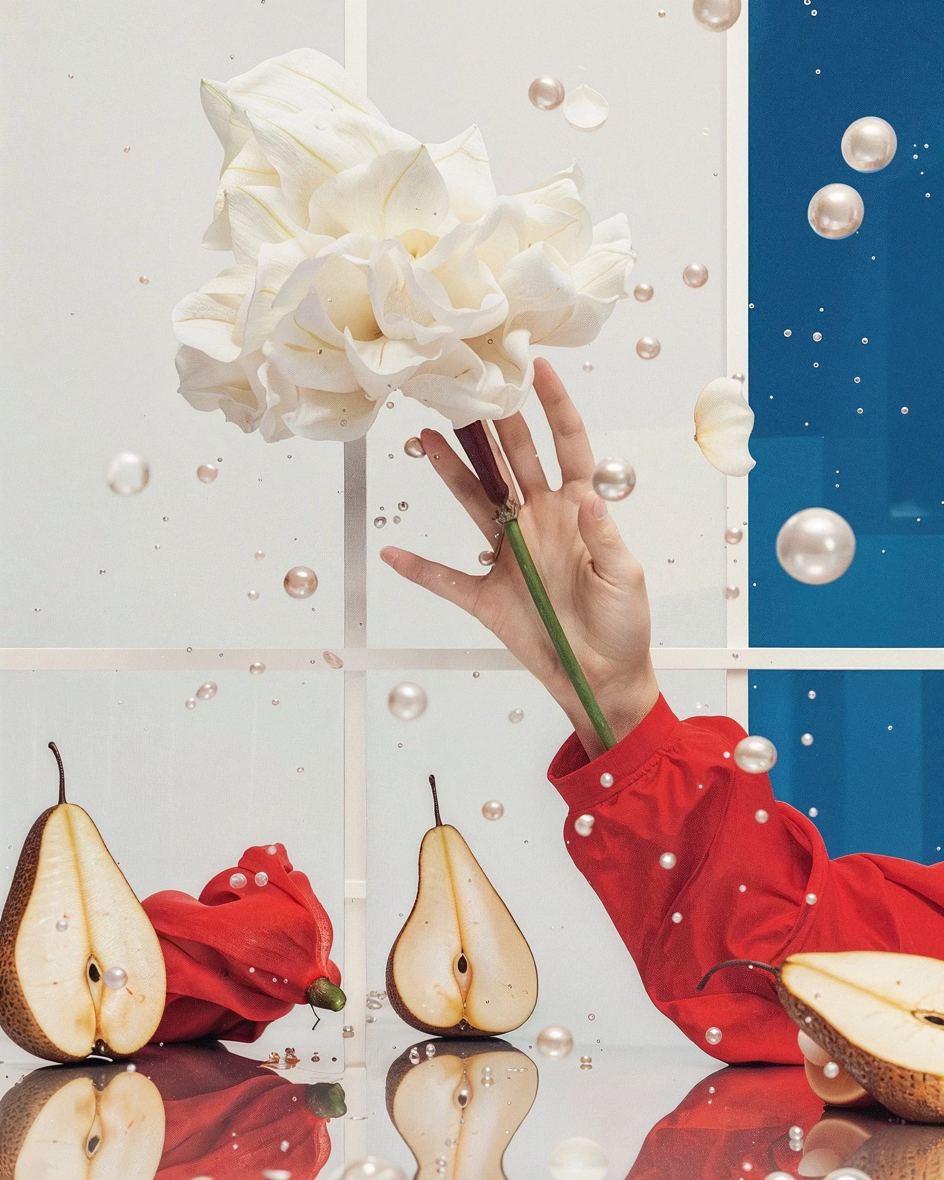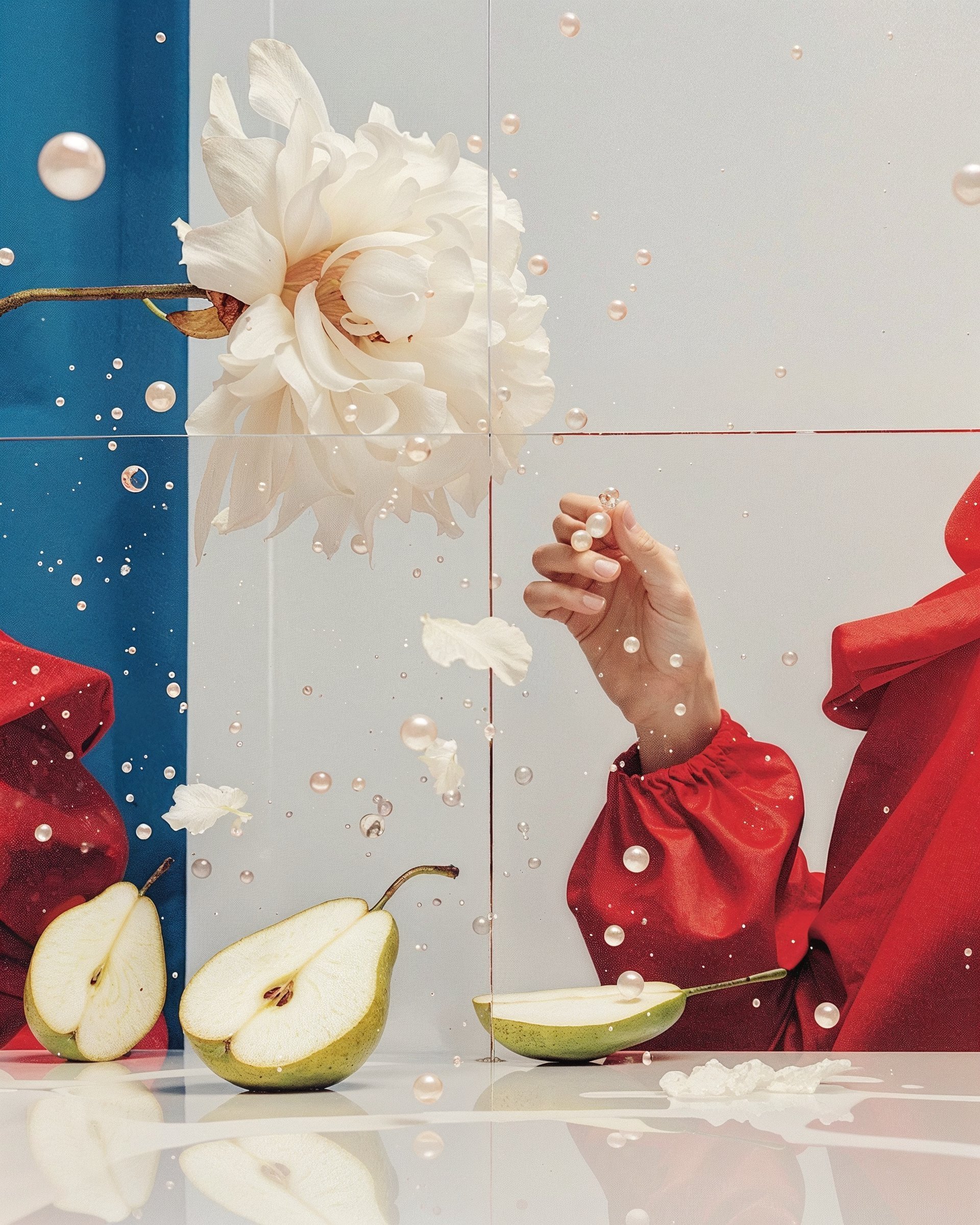This avant-garde concept explores the delicate balance between purity and passion, symbolized by white orchids and red poppies, and the timeless wisdom encapsulated in hovering pearls.