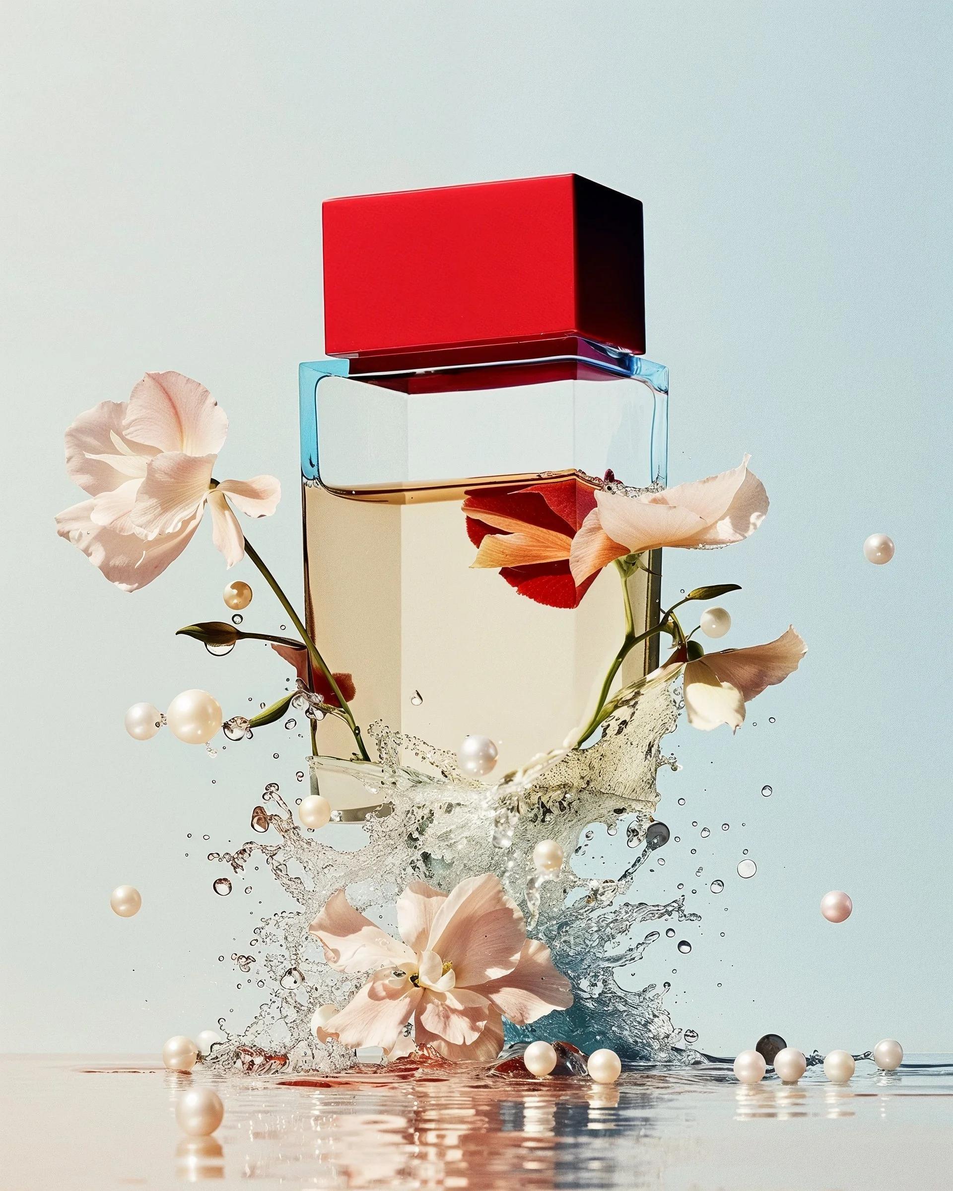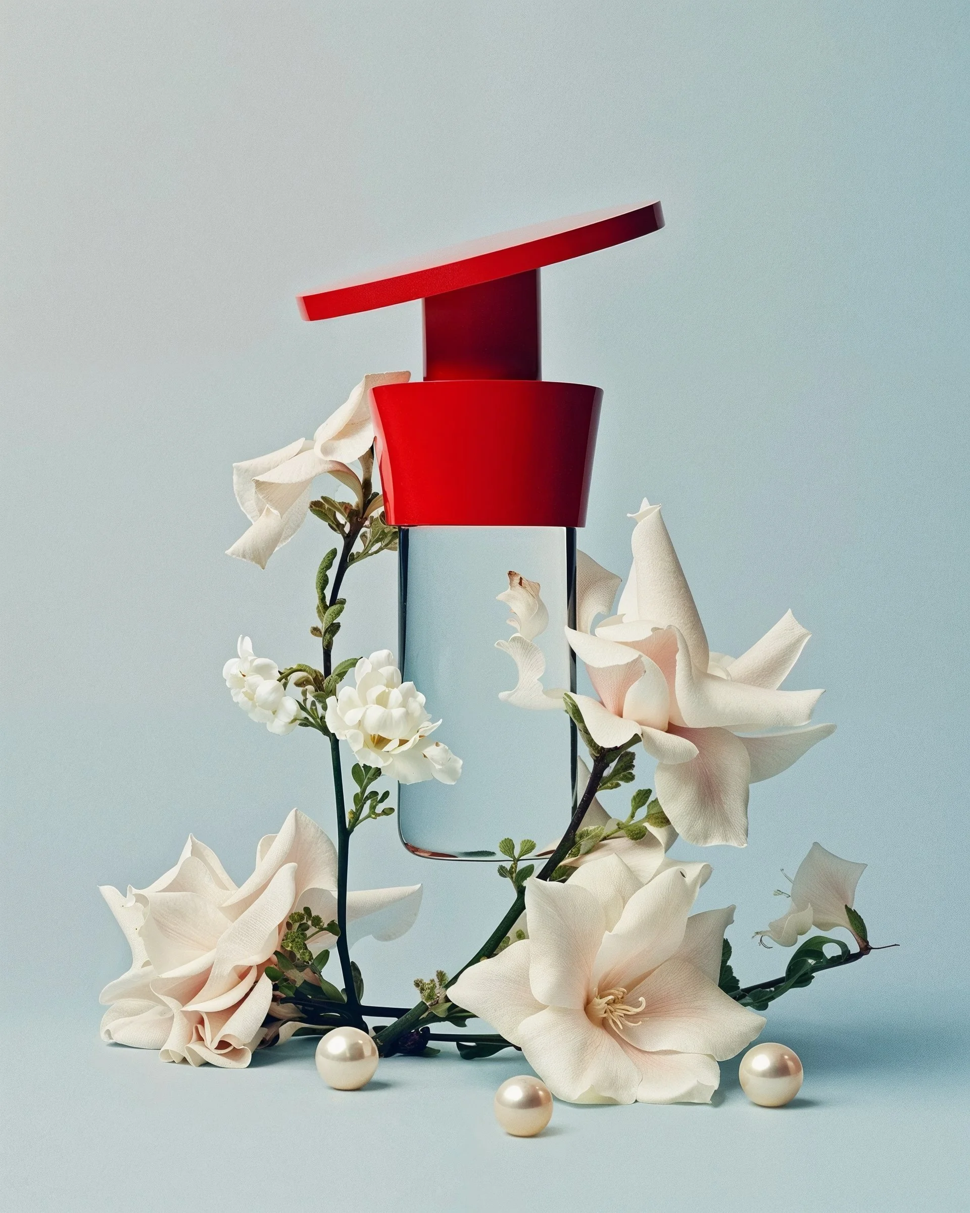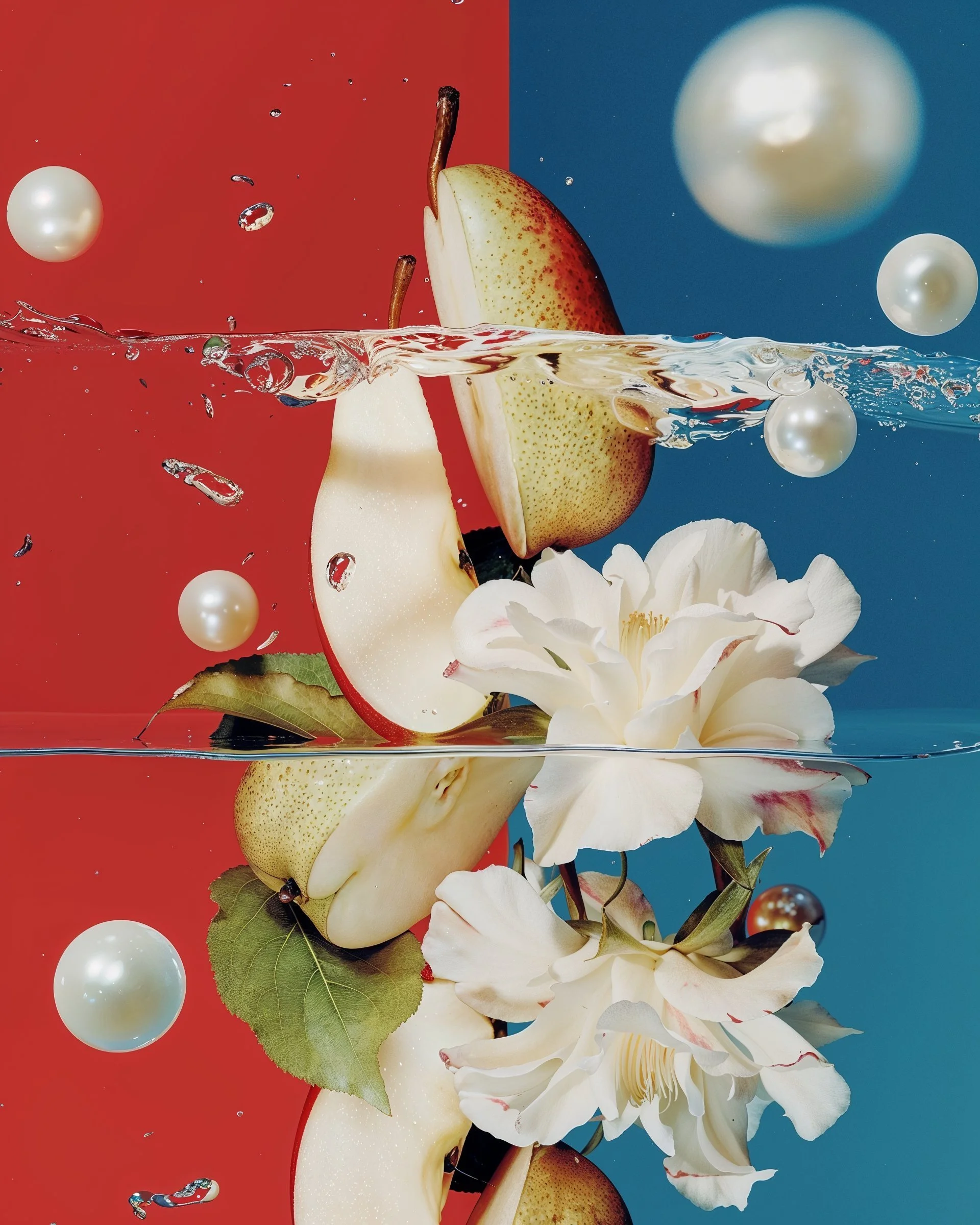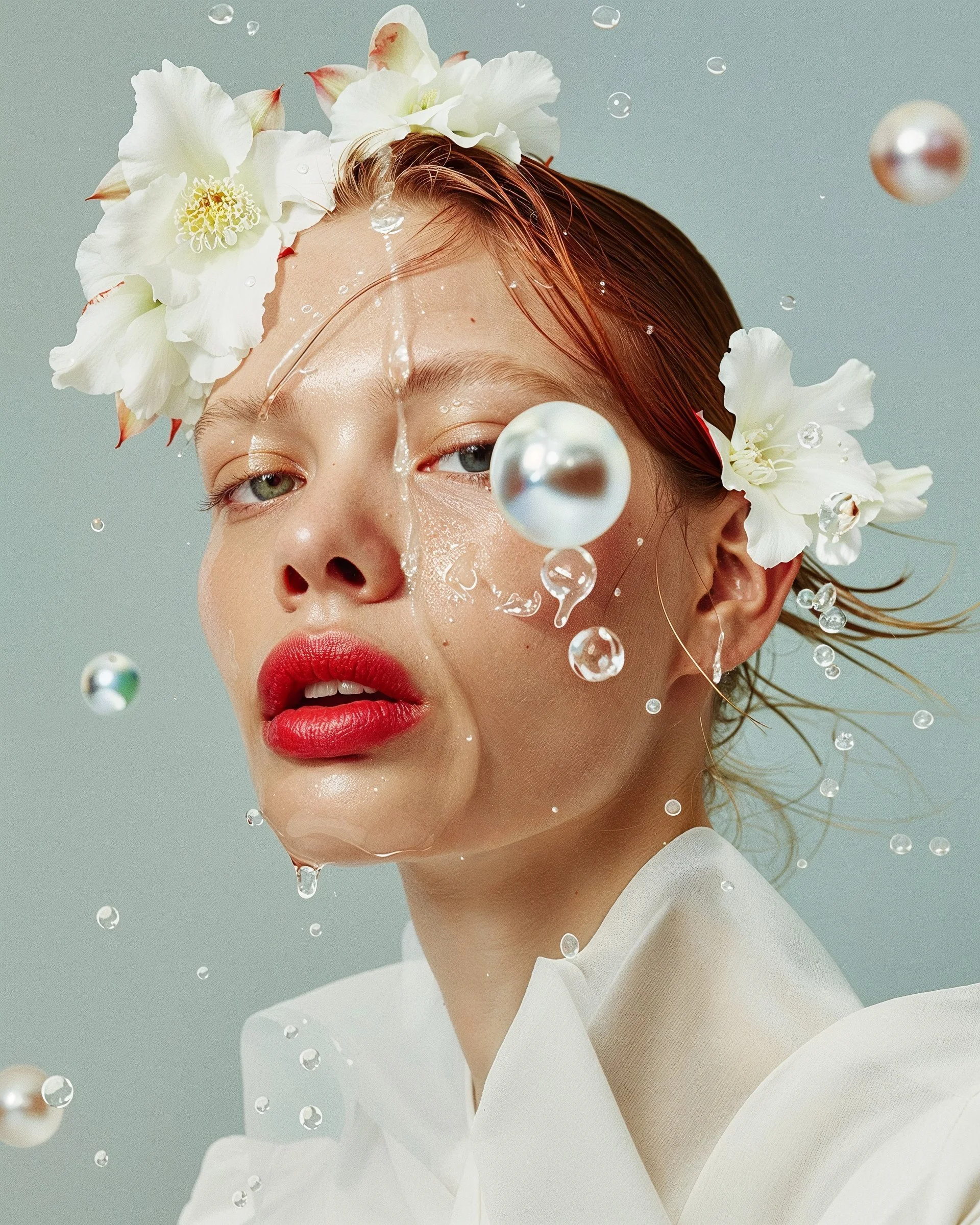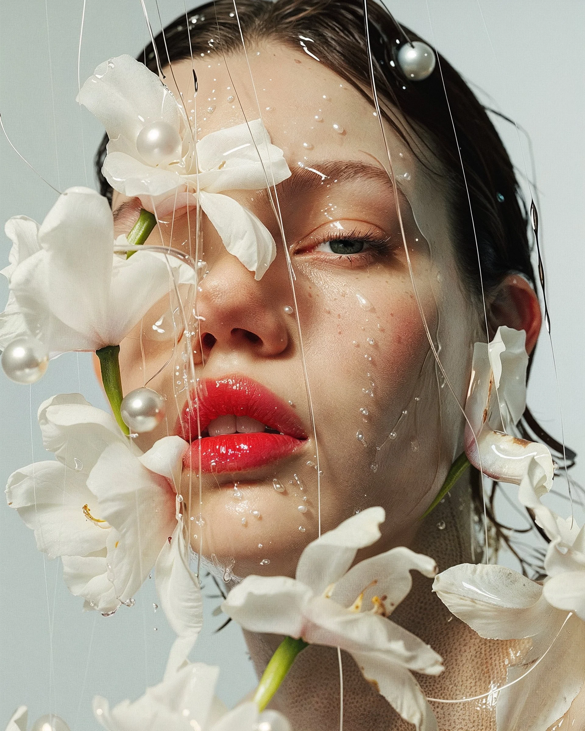 This avant-garde concept explores the delicate balance between purity and passion, symbolized by white orchids and red poppies, and the timeless wisdom encapsulated in hovering pearls.