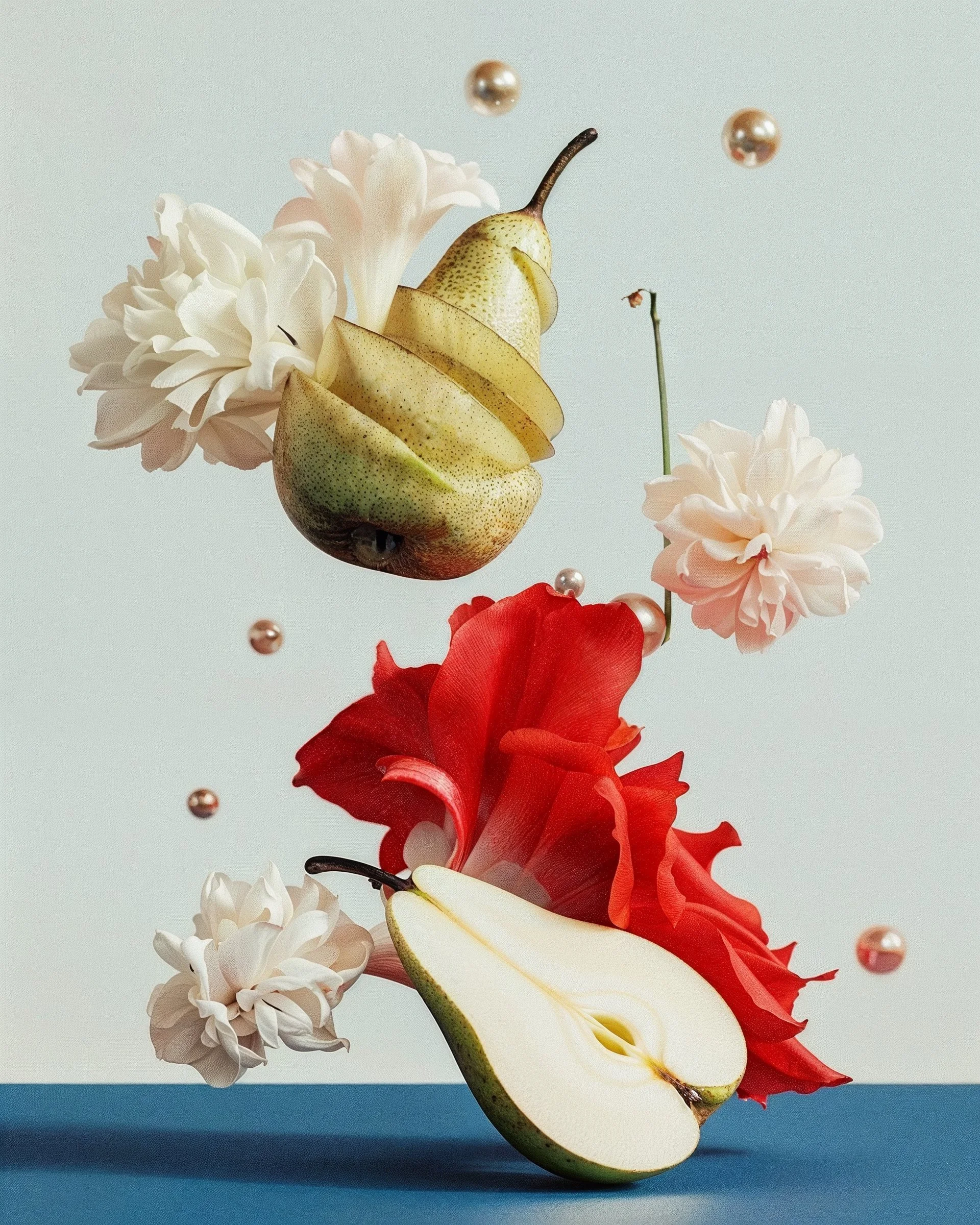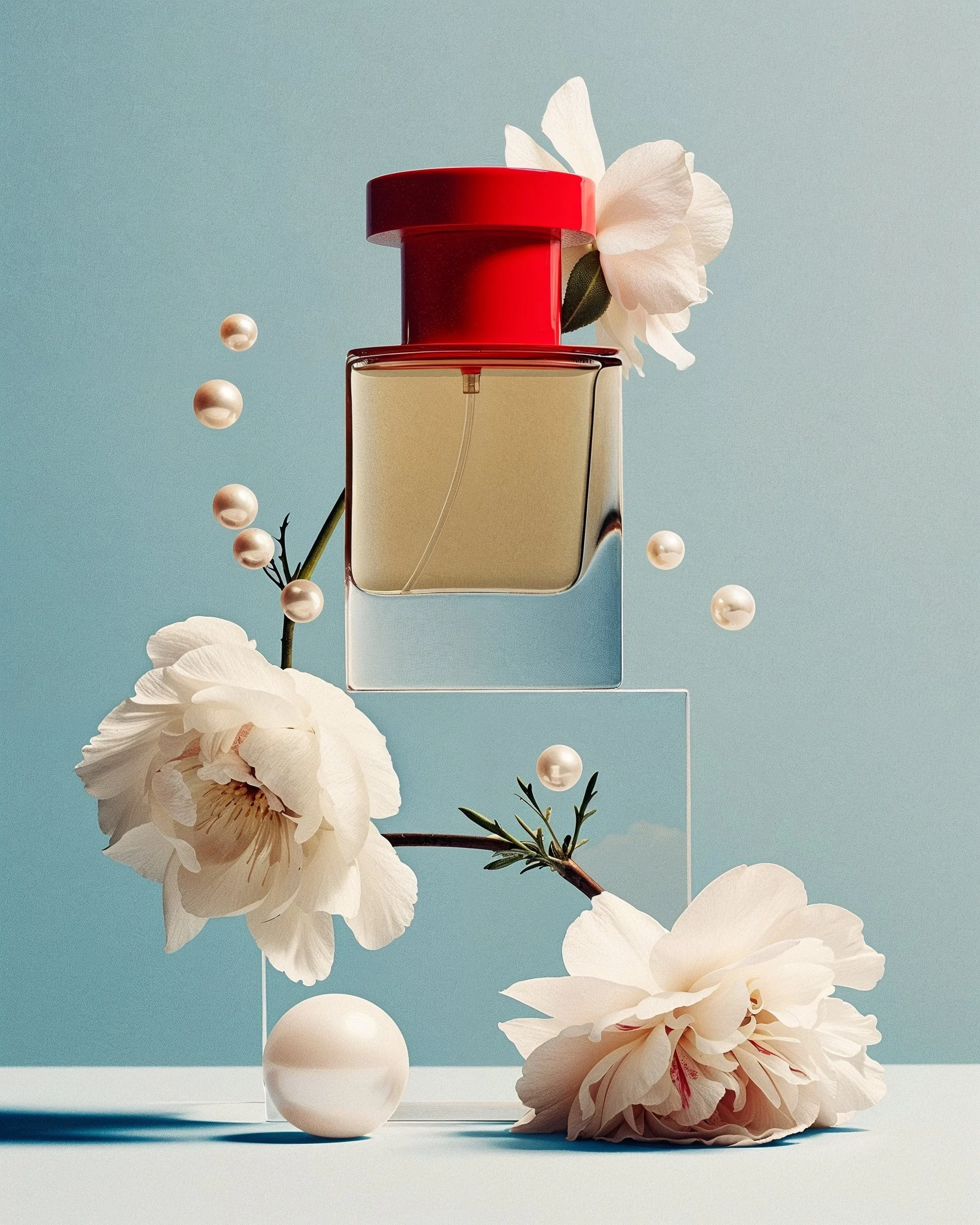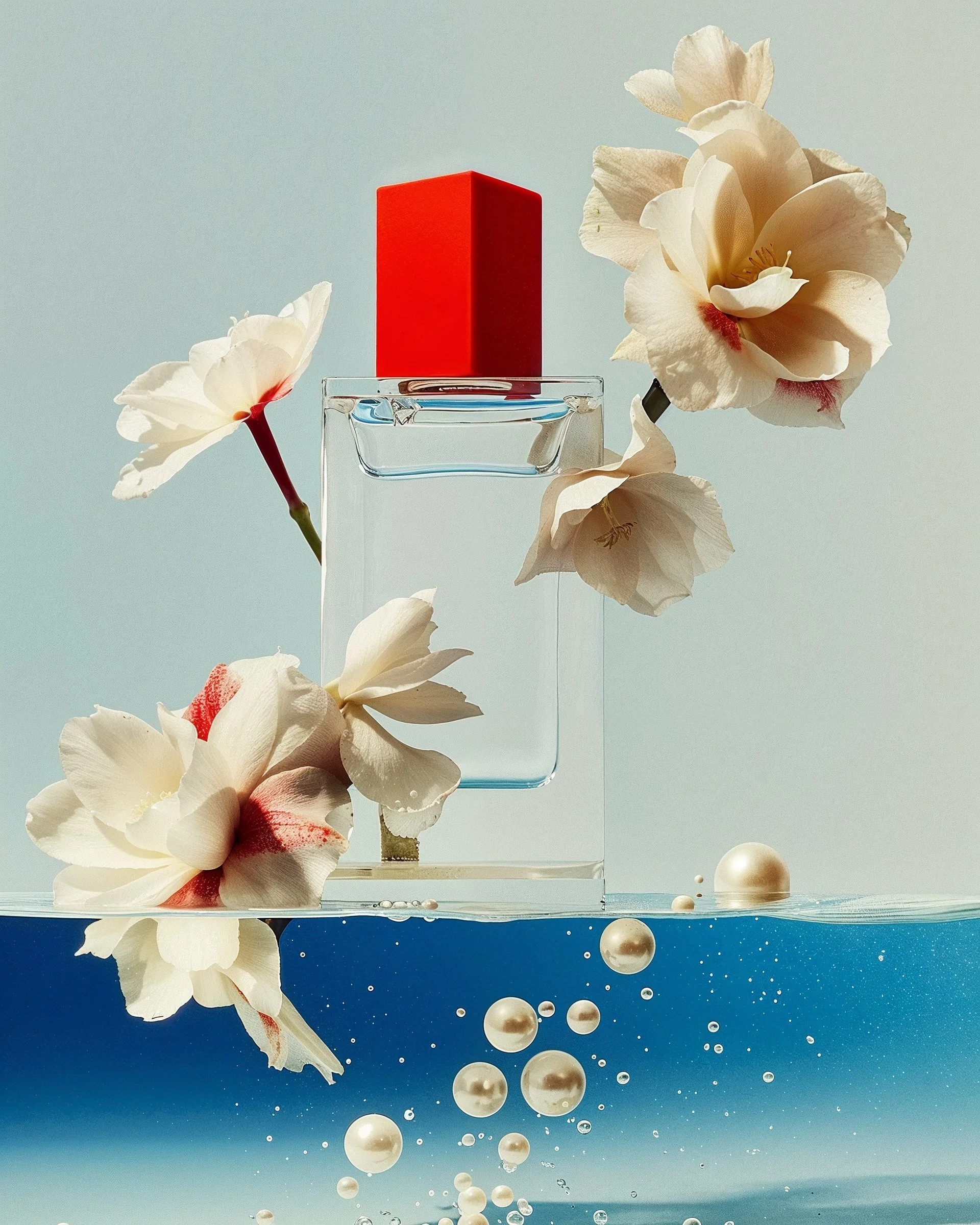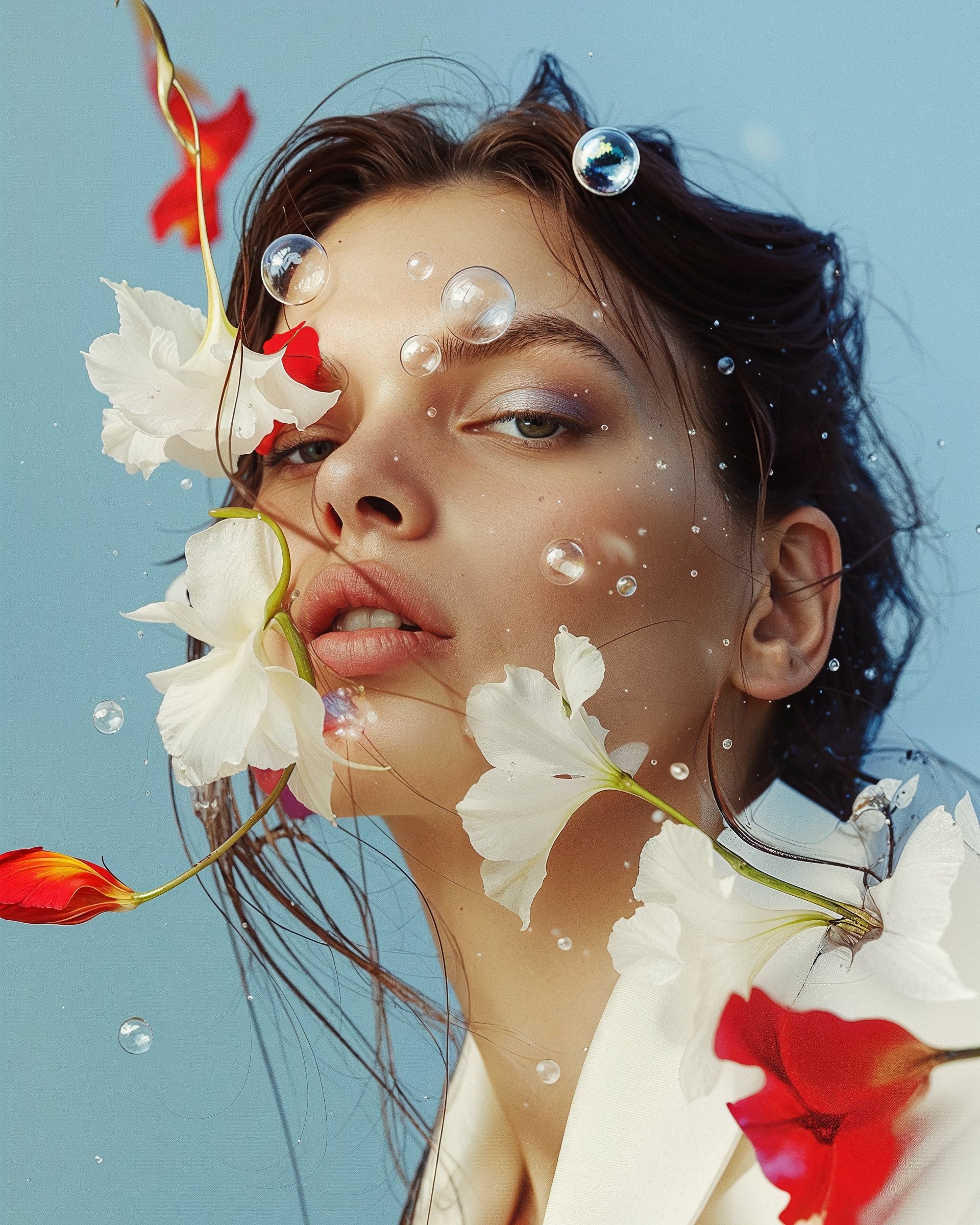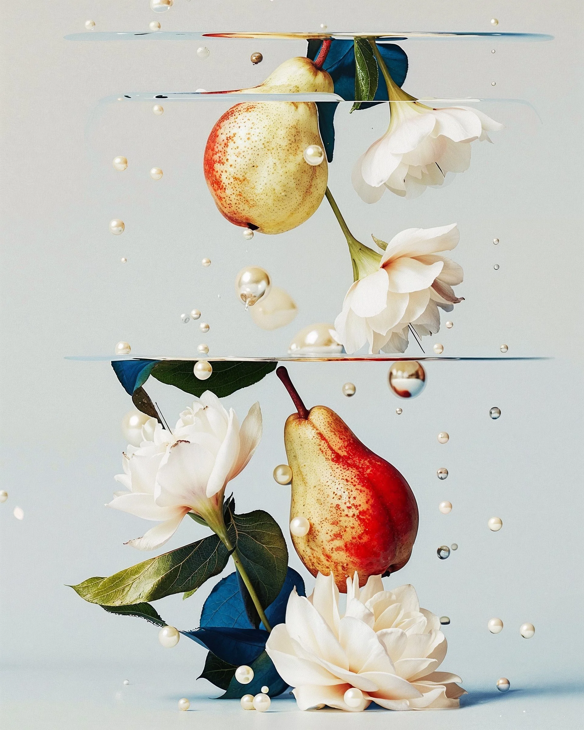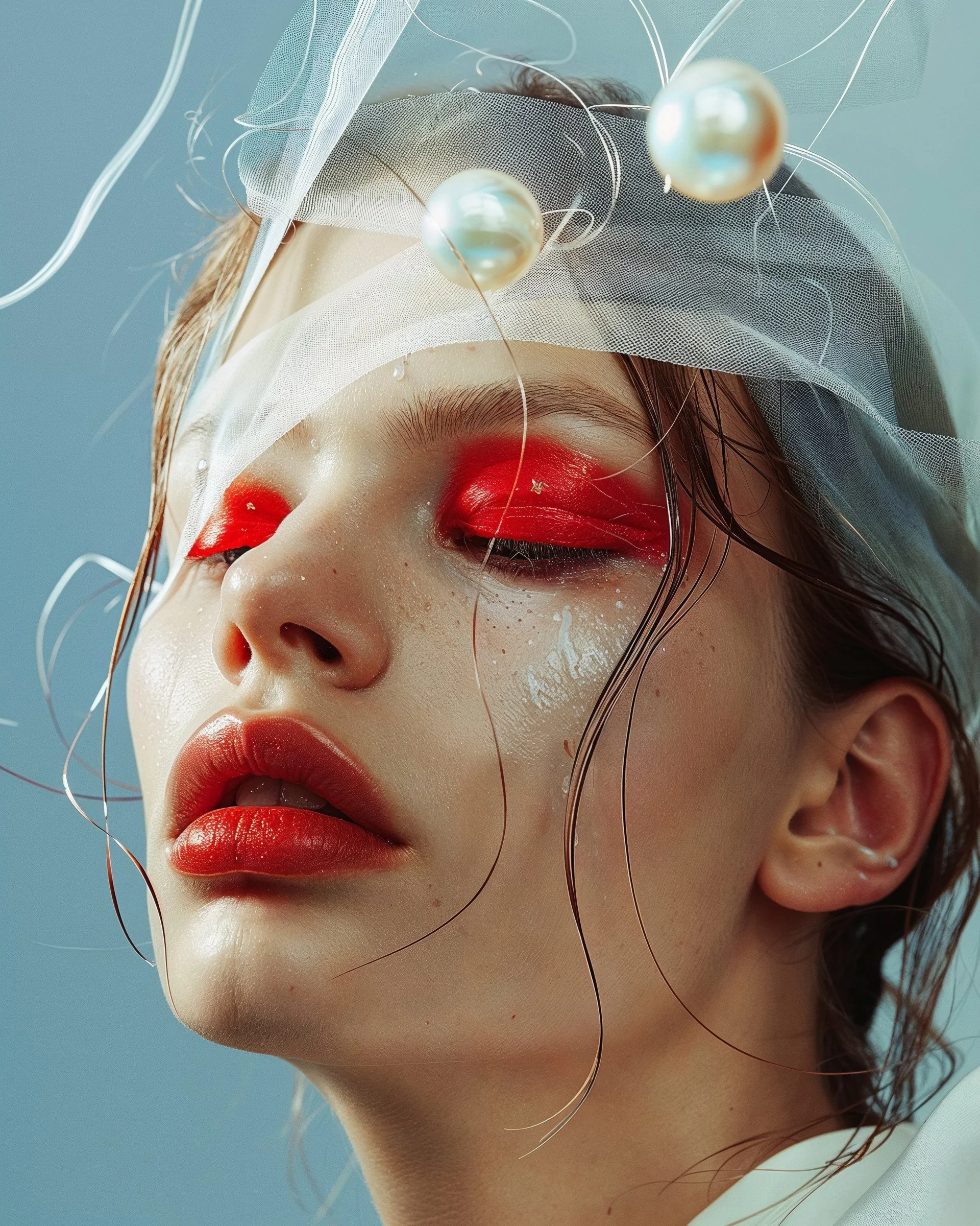 This avant-garde concept explores the delicate balance between purity and passion, symbolized by white orchids and red poppies, and the timeless wisdom encapsulated in hovering pearls.