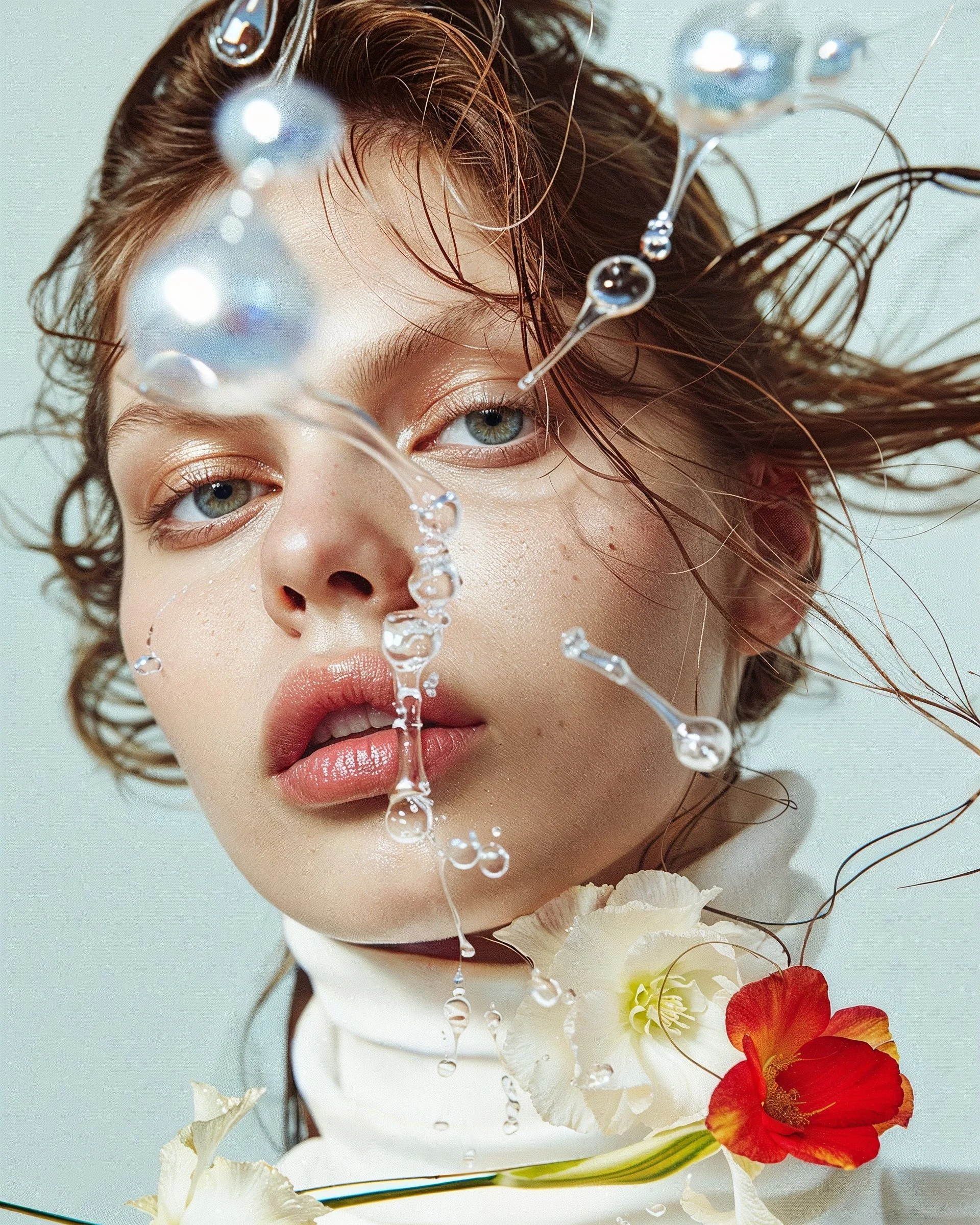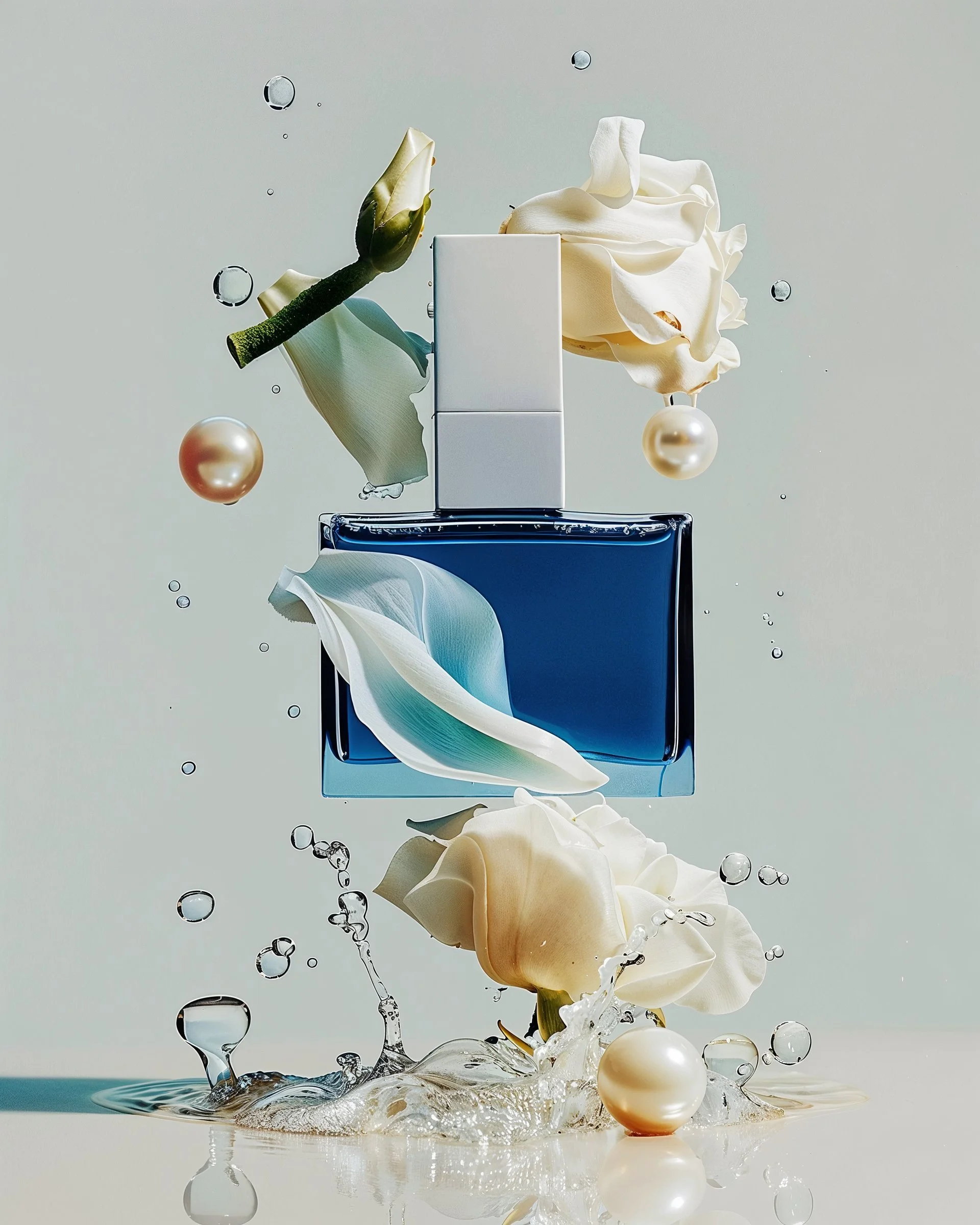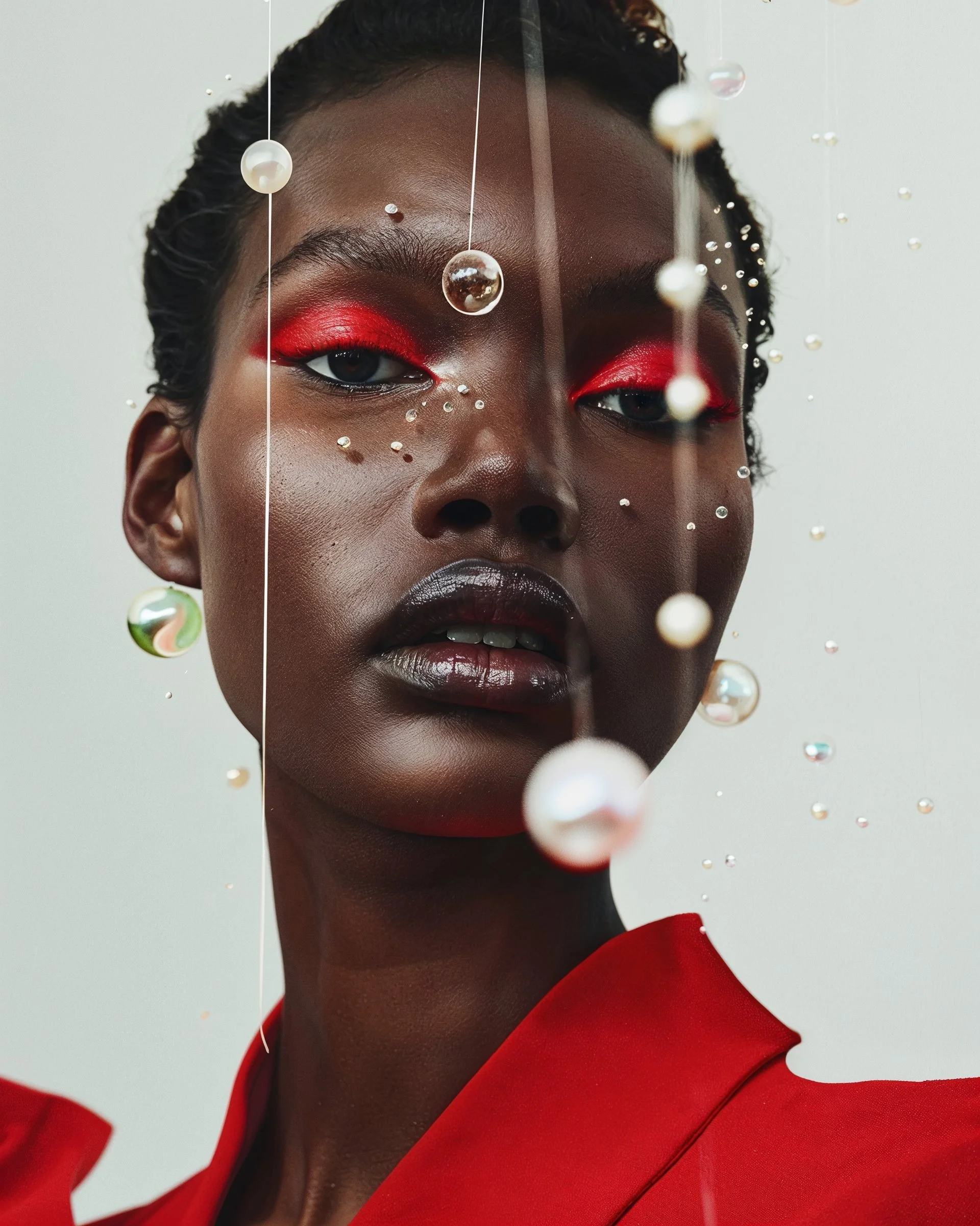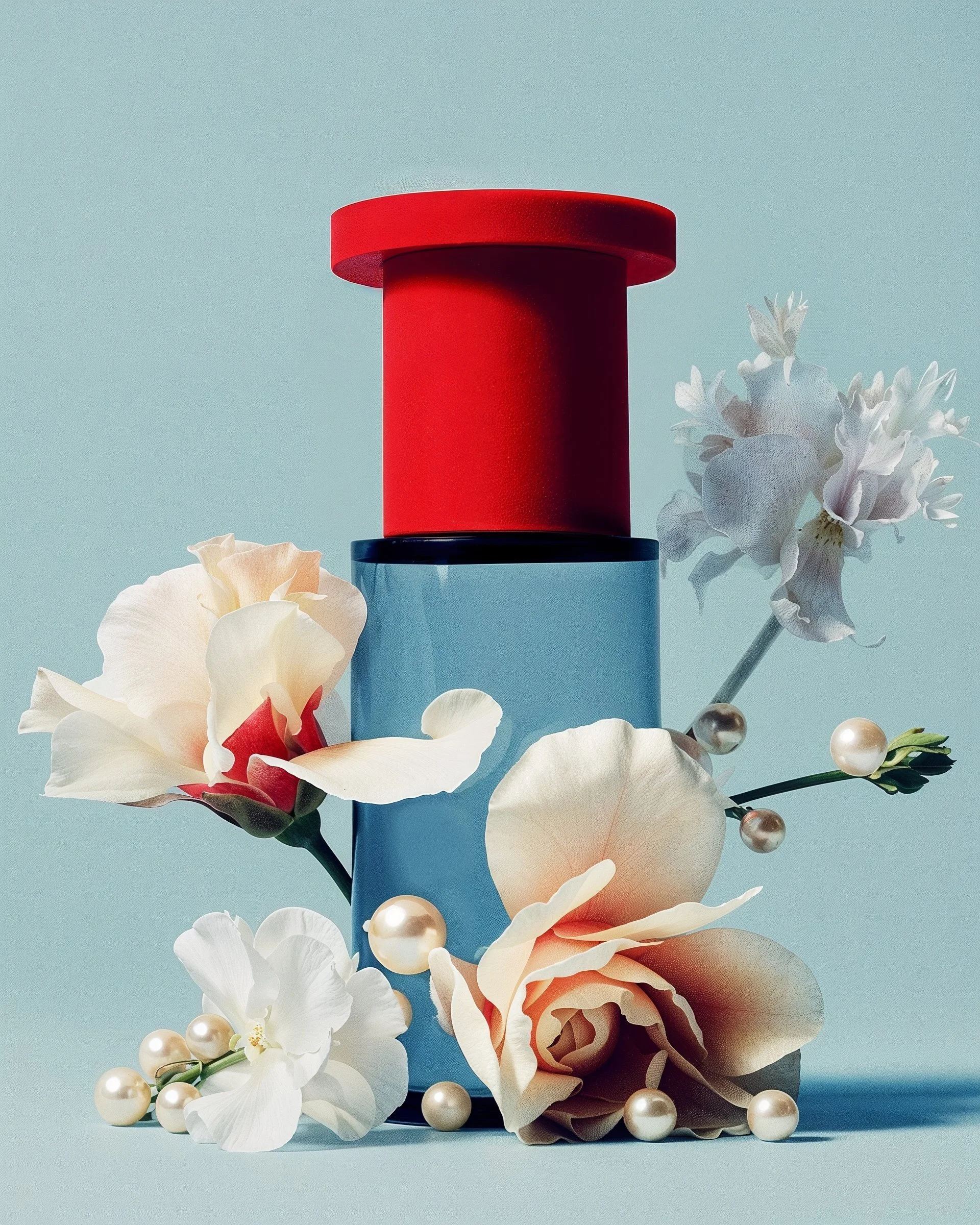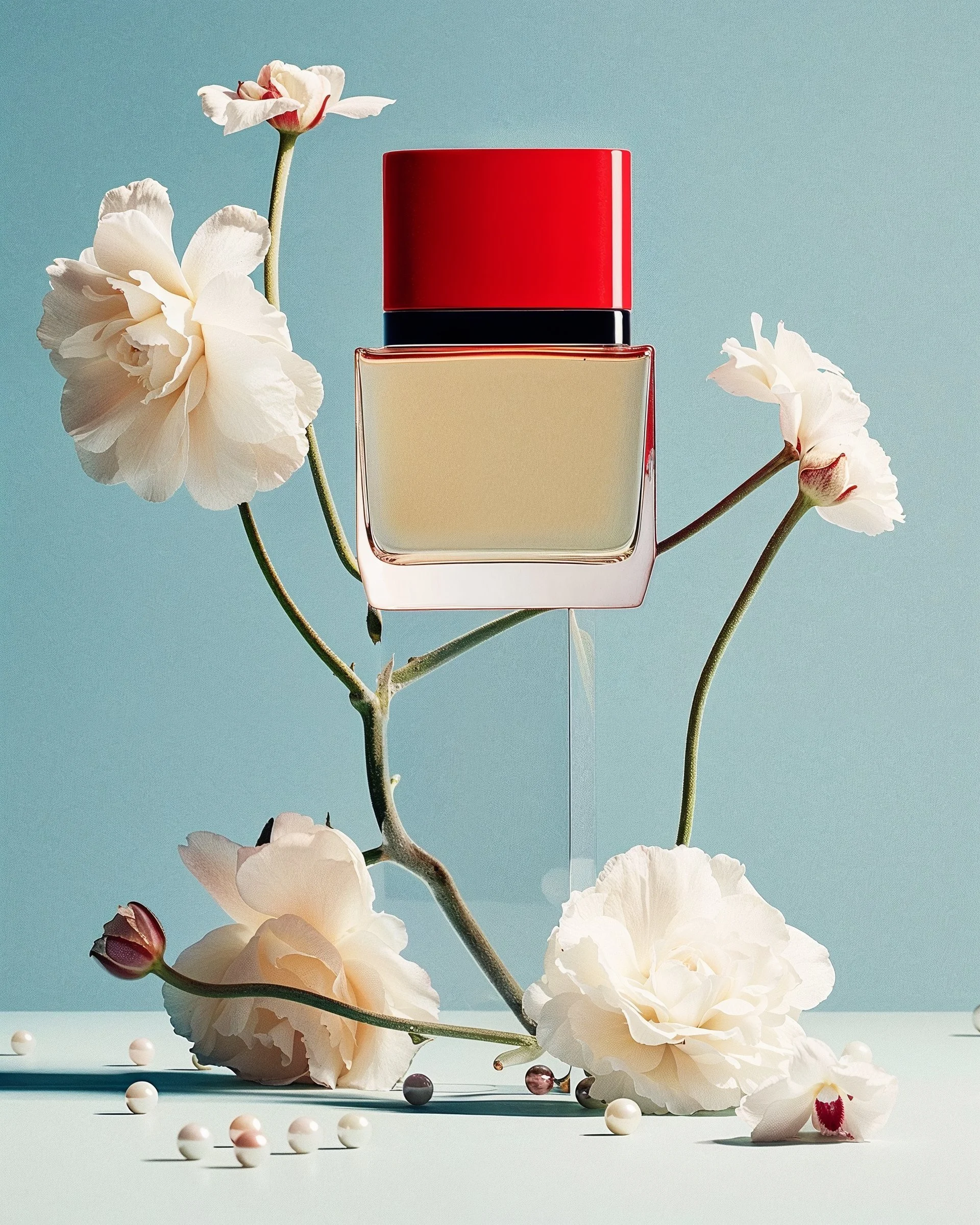 This avant-garde concept explores the delicate balance between purity and passion, symbolized by white orchids and red poppies, and the timeless wisdom encapsulated in hovering pearls.