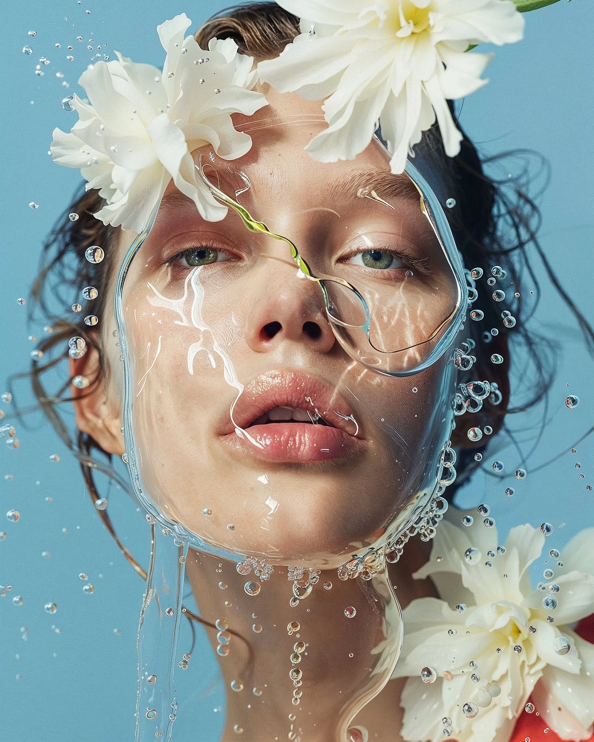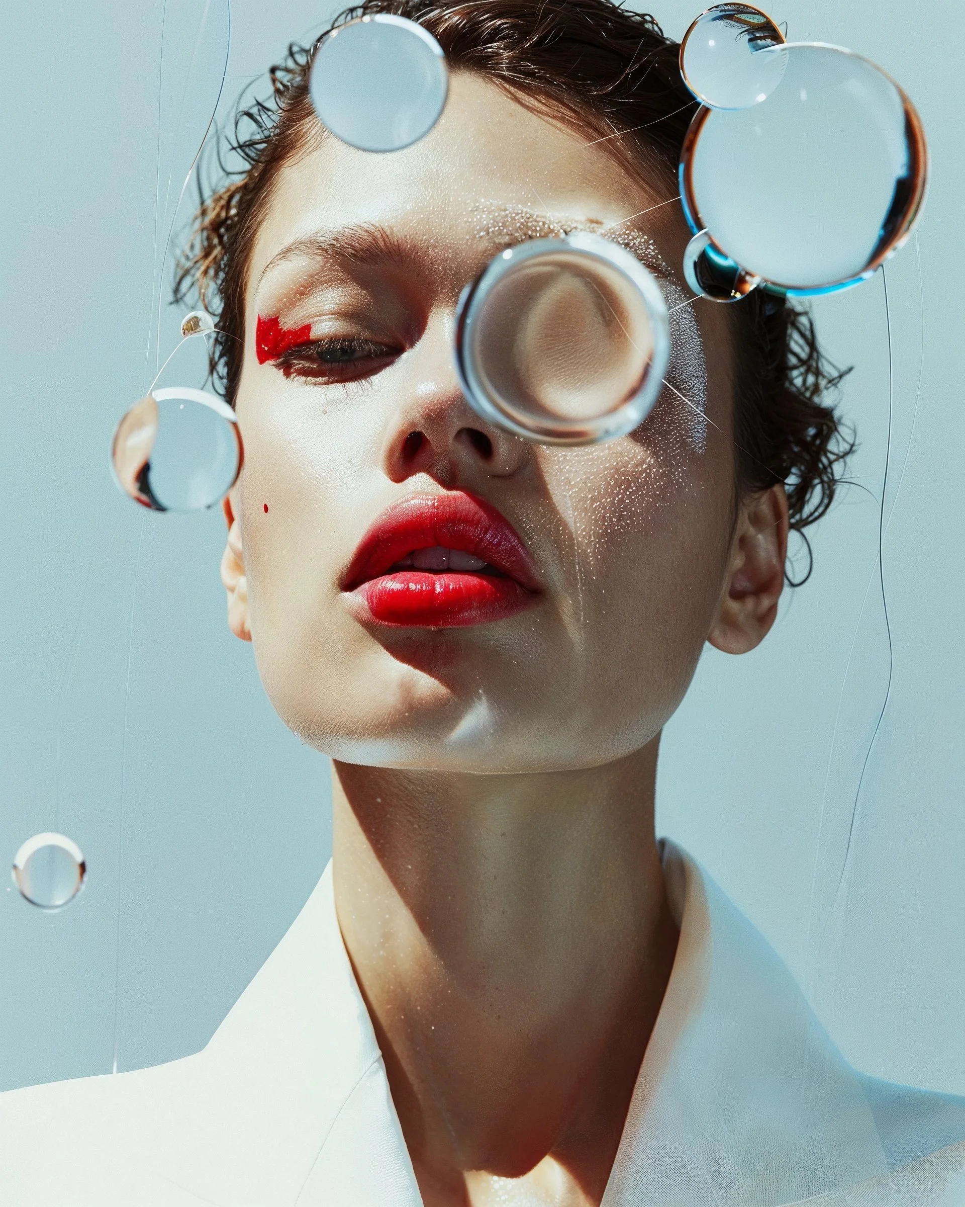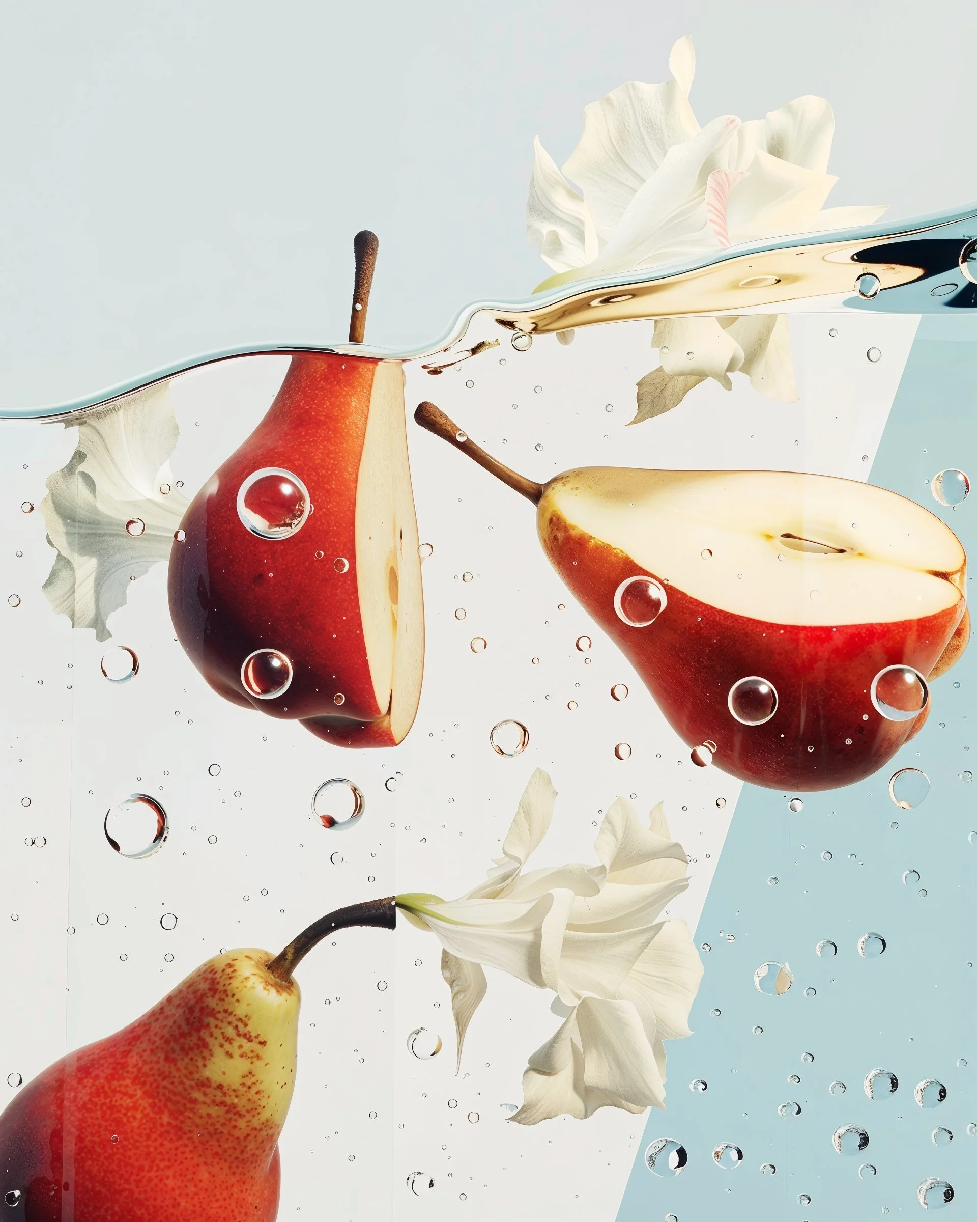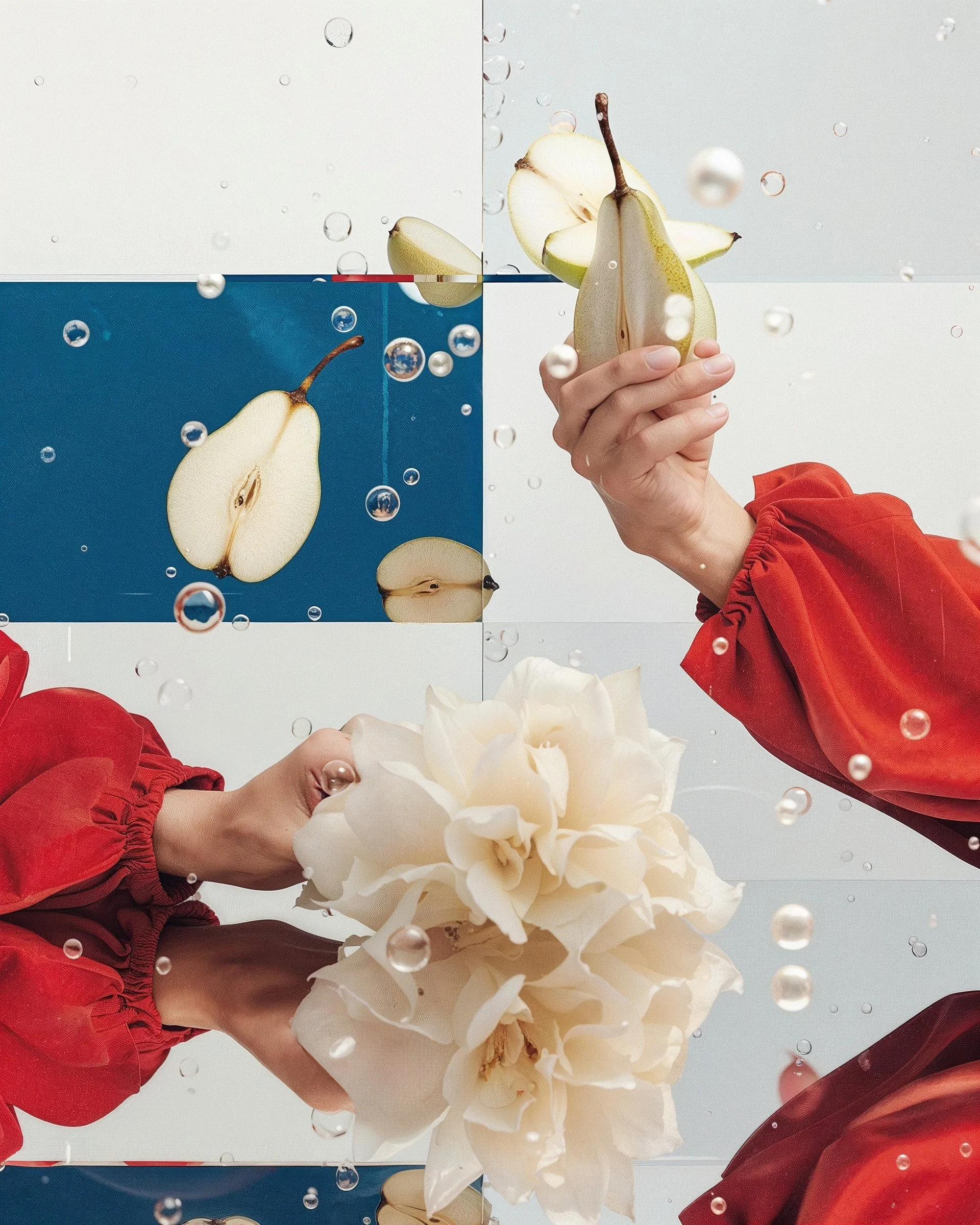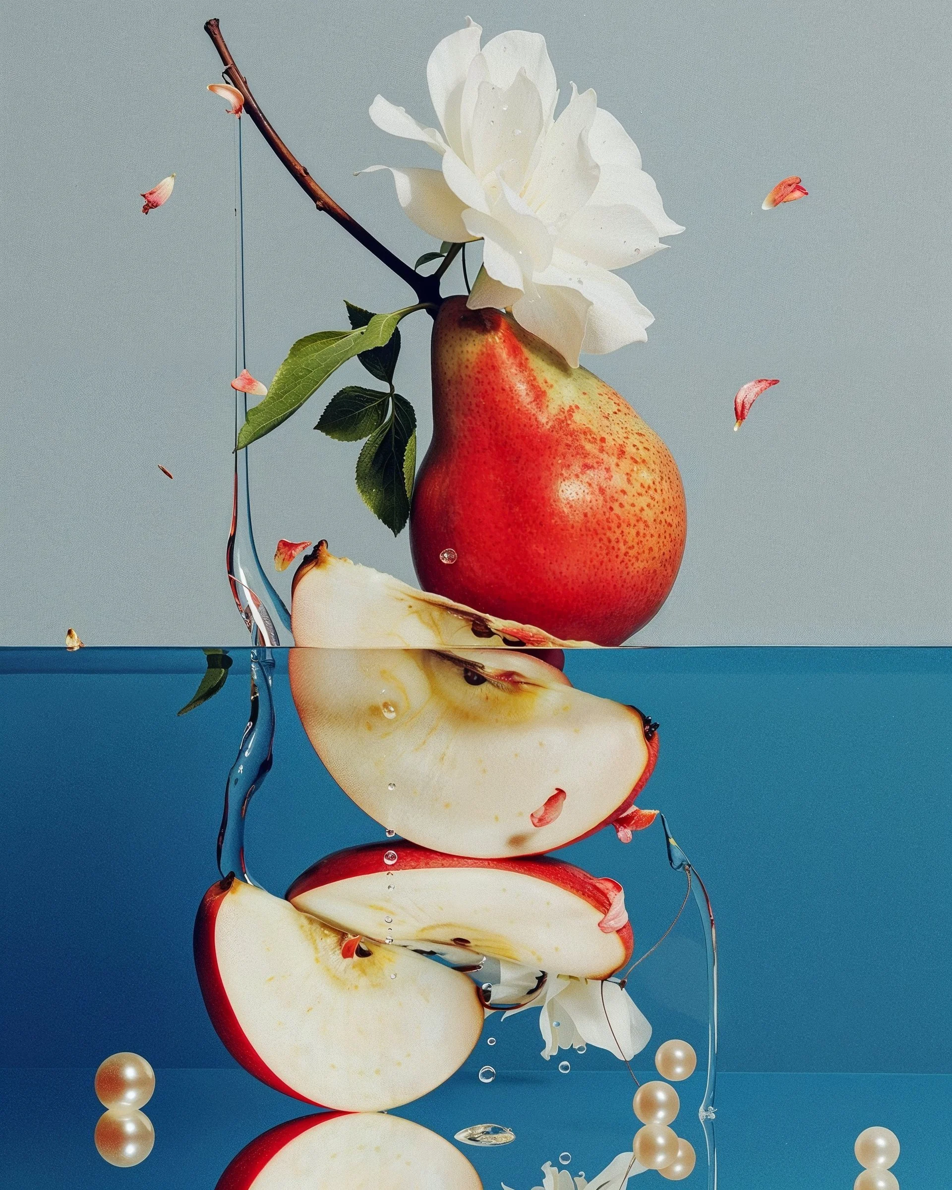 This avant-garde concept explores the delicate balance between purity and passion, symbolized by white orchids and red poppies, and the timeless wisdom encapsulated in hovering pearls.